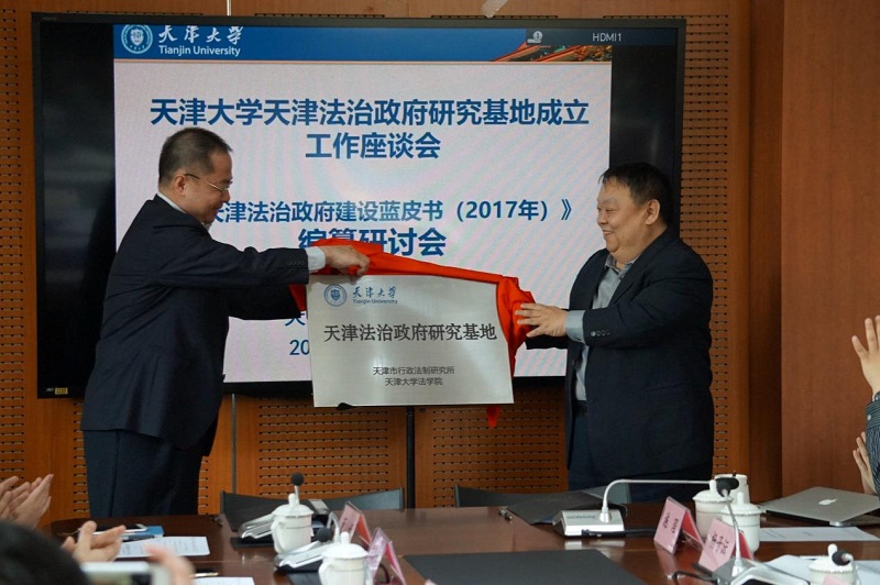 谭欣、雷颖君共同为天津大学天津法治政府研究基地揭牌。