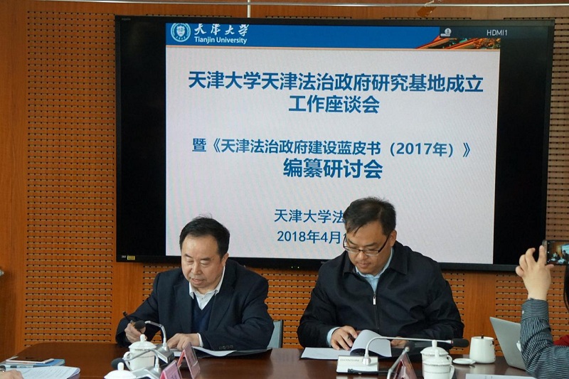 本站讯(通讯员 郭金石 摄影 丁宇 达亚冲)4月12日,天津大学建立天津法治政府研究基地并召开《天津法治政府建设蓝皮书(2017年)》编纂研讨会。天津市政府法制办公室主任雷颖君,天津市政府法制办公室副巡视员徐至忠,天津市政府法制办公室综合业务处处长梁海龙,天津市行政法制研究所副所长张志锋,天津市行政法制研究所联络部负责人杨子沄,天津市行政法制研究所干部王晓昱;天津大学副校级领导谭欣教授,法学院院长孙佑海,法学院党委书记杨欢,文科办公室副主任、人文社科处副处长刘一,法学院教授魏健馨、刘晓纯等出席会议。仪式由孙佑海主持。