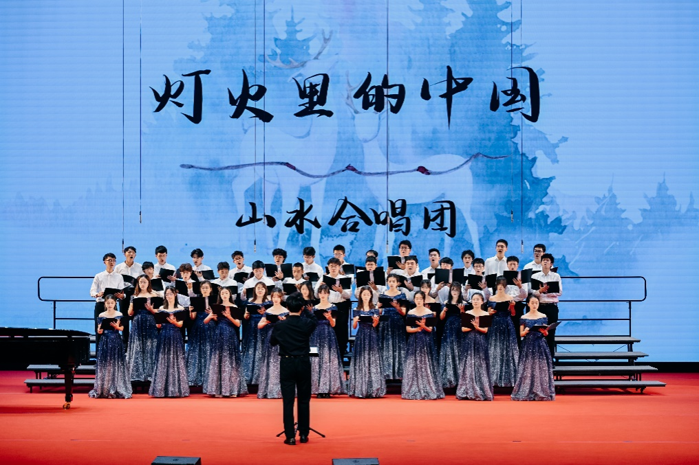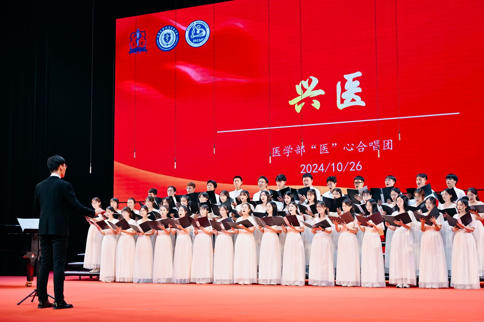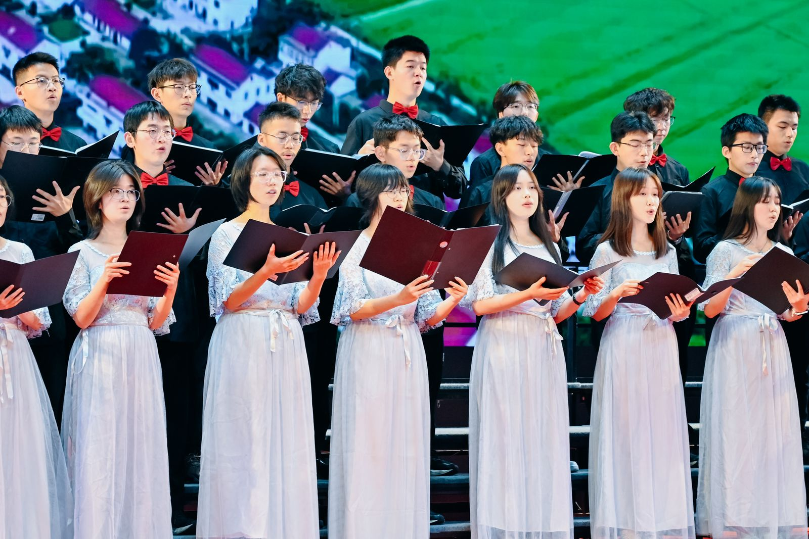 演出在雄壮的国歌声中拉开帷幕。来自全校27个学院(部)的19支合唱团为现场观众带来了精彩的演出,《我爱你中国》《歌唱祖国》《天耀中华》《国家》等合唱曲目在求实会堂唱响,用饱含深情的音符和充满力量的旋律述说天大青年的拳拳爱国情,殷殷报国志。同学们深情演绎的《有我》《如愿》《我们都是追梦人》等曲目,将青年的激情、朝气和梦想娓娓道来,彰显天大青年把青春理想、青春奋斗融入到中华民族伟大复兴壮阔征程的志向。由“医心合唱团”带来的原创歌曲《兴医》,唱出了医学领域学生肩负兴医重任,力求科技报国的责任感与使命感。微颂合唱团演唱了原唱歌曲《漫途》,歌曲旋律悠扬,意蕴深远,书写着青春洋溢的天大人奋进新征程的强烈愿望。