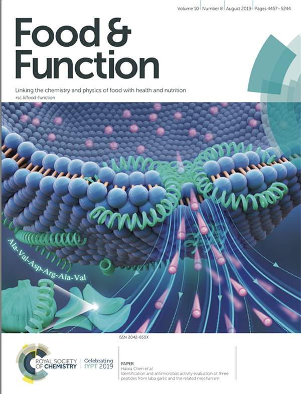 本站讯 (通讯员 武杉)2019年8月,英国皇家化学学会旗下的国际著名科学期刊《Food & Function》(中科院分区一区,Top期刊)以封面文章的形式刊发了天津大学药学院陈海霞教授团队在天然抗菌肽鉴定及作用机制方面取得的科研成果《Identification and antimicrobial activity evaluation of three peptides from laba garlic and the related mechanism》(DOI: 10.1039/c9fo00236g)。论文第一作者是药学院博士生高旭东,通讯作者为陈海霞教授,天津大学为第一署名单位。