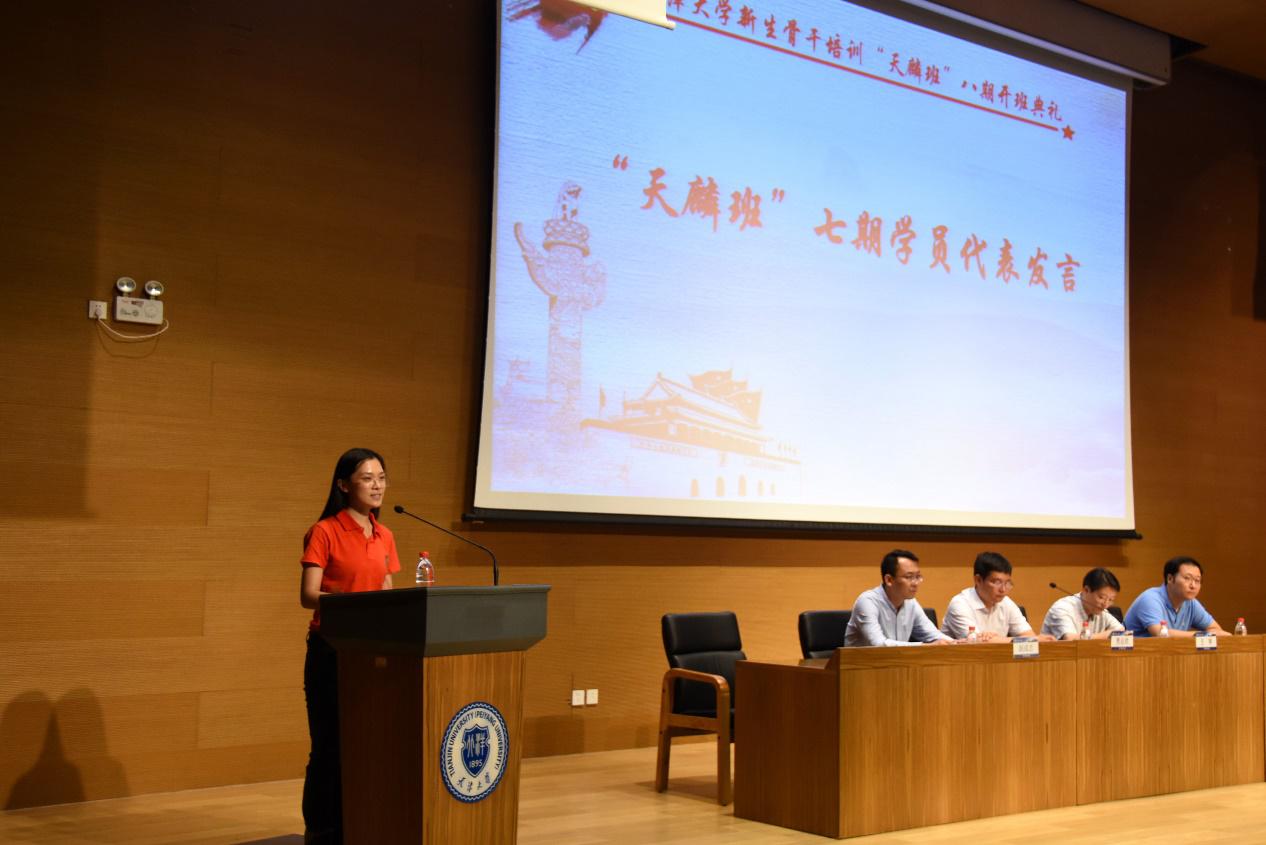 随后,“天麟班”七期学员田烁代表往期学员向“天麟班”八期学员们分享了自己的“天麟记忆”。她说到,是“天麟班”改变了自己;是集中培训阶段的丰富活动,在她的心中种下了“信仰”与“担当”的种子。发言最后,她提出,希望“小天麟”们以“天麟班”为起点,用双脚丈量青春的无限可能,不辜负厚重北洋的期望,做真正“立天大志向、展天大襟怀、承天大责任”的人。