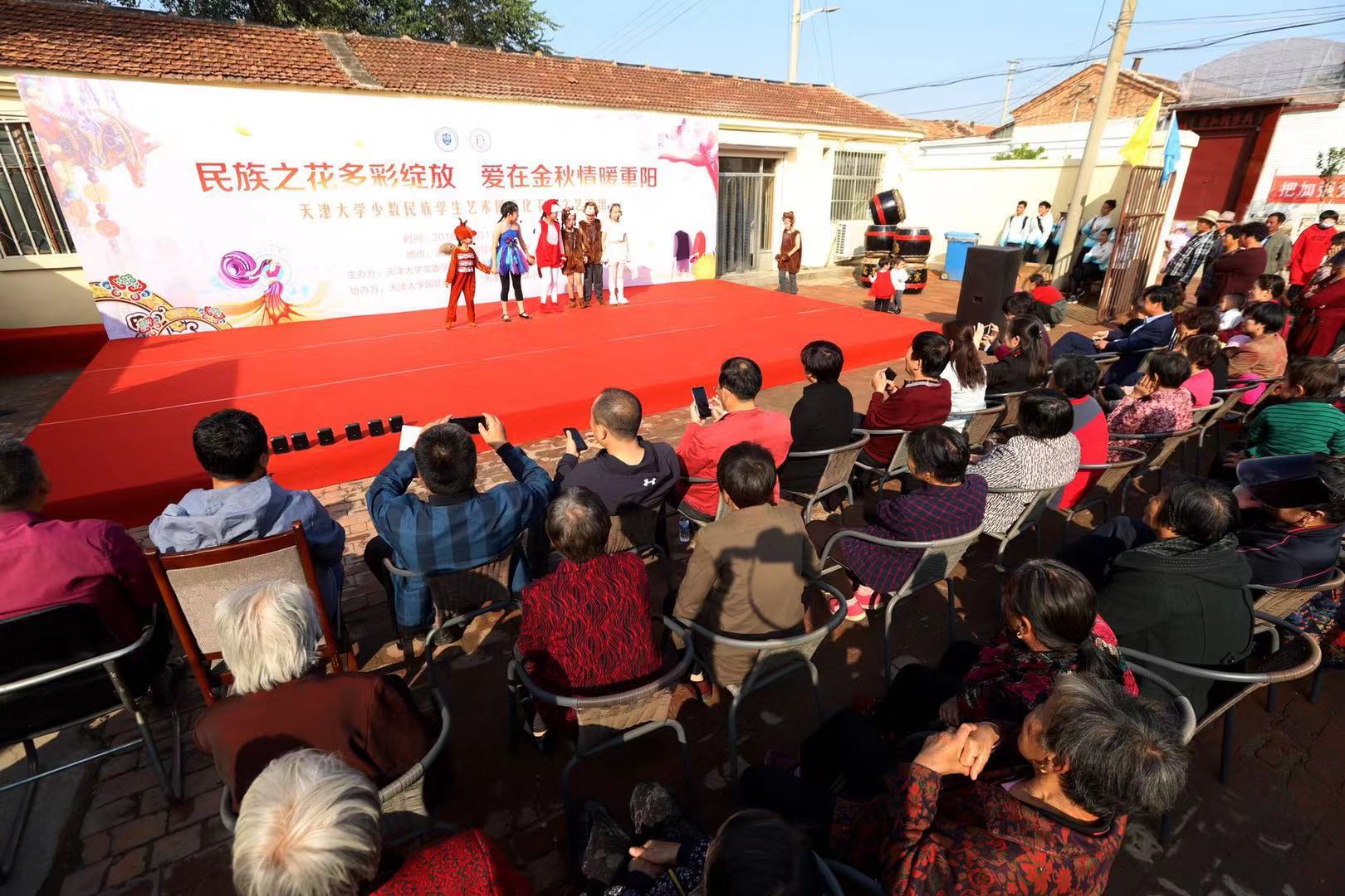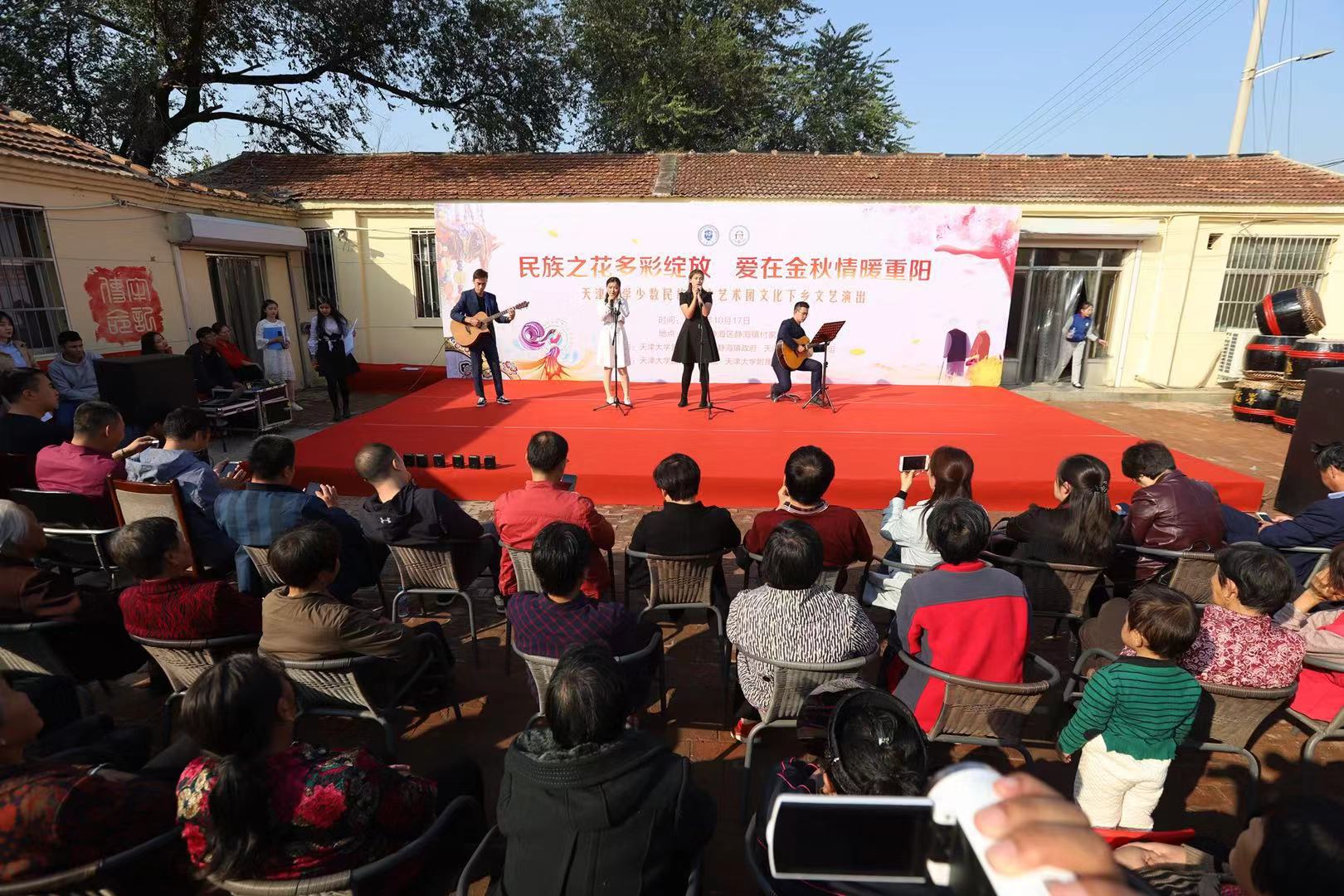 本站讯(记者 赵习钧 通讯员 朱华 依达 摄影 赵习钧)10月17日恰逢第五个国家扶贫日和重阳节,天津大学学工部、天津大学国际教育学院、天津大学附属小学、天津大学驻静海区付家村工作组联合举办“民族之花多彩绽放 爱在金秋情暖重阳”主题文艺汇演,凝聚发展正能量,启发民智,教化民风,为脱贫攻坚工作提供精神动力和文化支撑。天津大学党委学生工作部副部长李霞、天津大学国际教育学院副院长冯乐、天津大学附属小学副校长郄辉、静海镇人大主席刘庆祝、静海区第十三小学德育主任邢玉朋、天津大学驻村第一书记刘东海等出席活动。