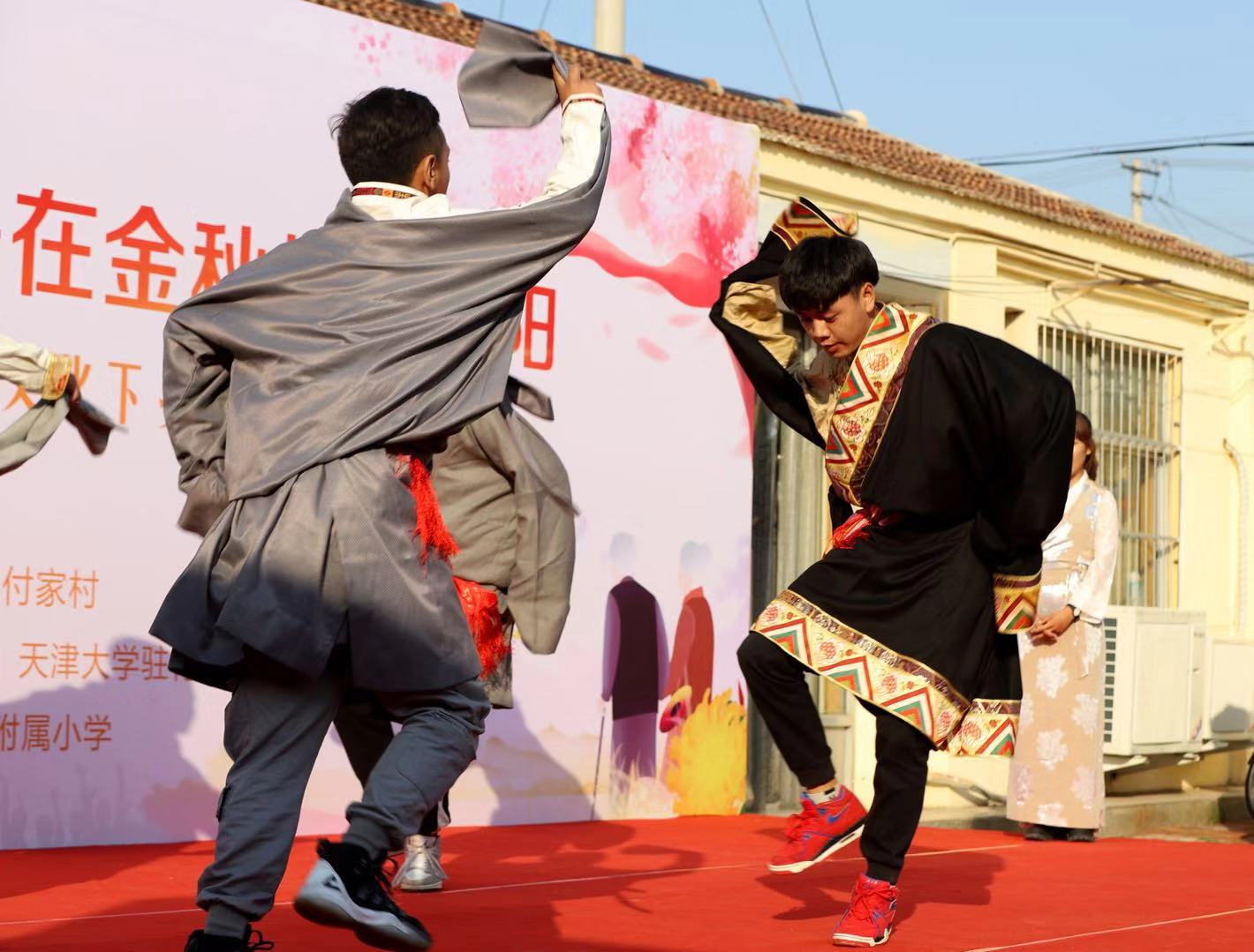 文艺表演分为“多彩青春新梦想、壮丽河山新时代、相亲相爱一家人”三个篇章,来自天津大学少数民族学生艺术团的70多名哈萨克族、藏族、维吾尔族等少数民族学生身着民族特色盛装,跳起黑走马、唱起雪域之声、跳起麦西来甫,为付家村的村民们献上了一台兼具时代特点和民族特色的文艺表演,引来现场掌声喝彩声不断。同时,来自天津大学附属小学的孩子们以及来自国际教育学院的留学生们也带来了英语舞台剧《骄傲的孔雀》、马来西亚二十四节令鼓《北洋之光》等节目。活动在群舞《大美新疆》中圆满结束。活动结束后,村民与学生们一起跳起欢快的集体舞,久久不愿散去。