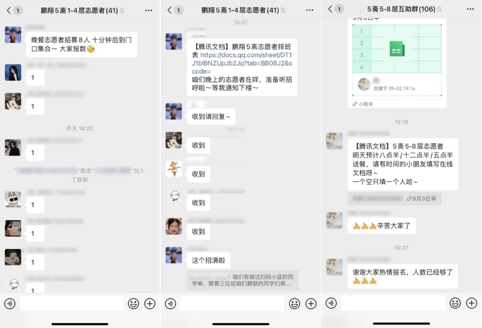 “今日需要志愿者送饭,可以的请报名。”辅导员高芳卓老师号召非静默宿舍的同学成为志愿者,承担送饭、组织核酸检测等工作。消息刚发出短短几秒钟,人数已经招满!