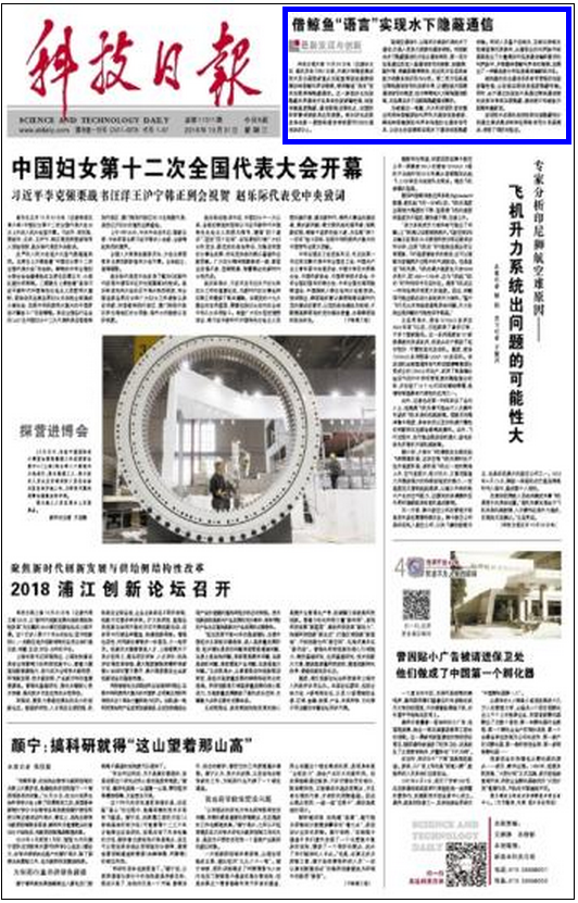 (记者孙玉松 通讯员赵习钧)日前,天津大学精密测试技术及仪器国家重点实验室蒋佳佳副教授模仿抹香鲸叫声串规律,首次借用鲸鱼“语言”实现水下隐蔽通信。