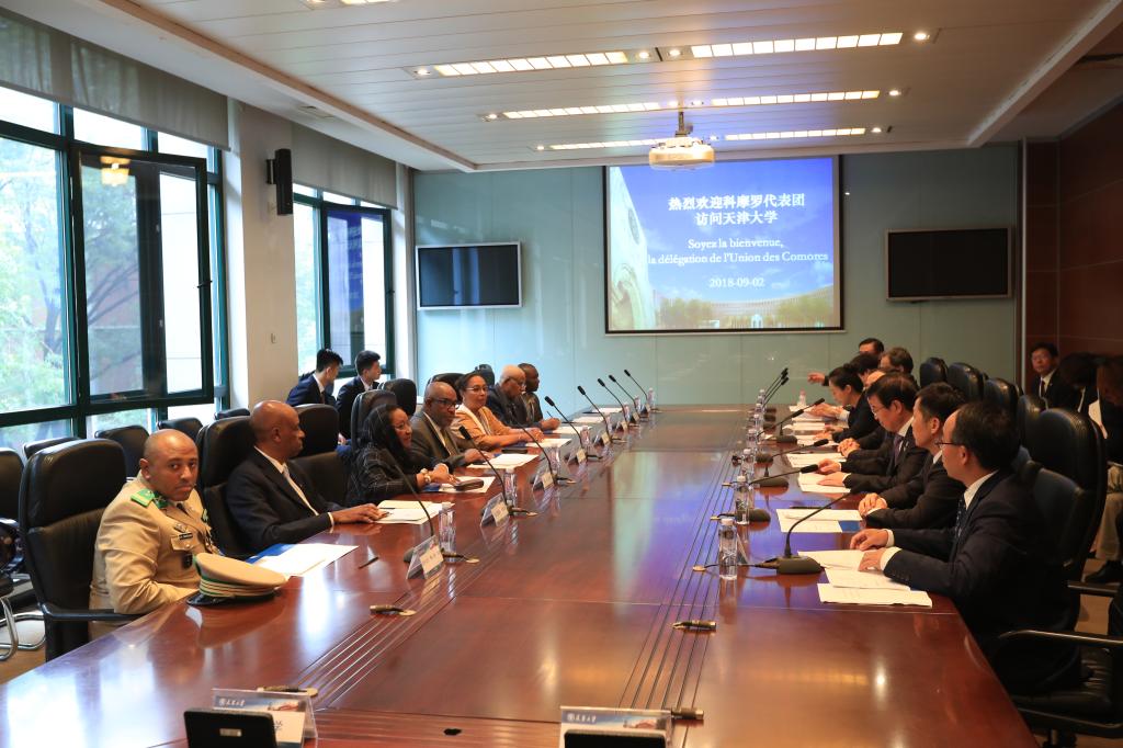 参观校史馆后,阿扎利总统一行移步会议楼进行会谈。会谈中,赵海山副市长对总统阁下在出席中非合作论坛北京峰会前夕来津访问表示由衷欢迎,并简要介绍了天津的历史与优势,祝愿天津与科摩罗关系再谱新章,双方教育合作再结硕果。李家俊代表天津大学对科摩罗代表团到访表示热烈欢迎,介绍了天津大学与科摩罗的渊源与合作愿景。他说,2018年初,科摩罗驻华大使马哈茂德•阿布德先生曾率团莅临天大,这为促进双方进一步交流与合作奠定了良好的基础。总统的女儿伊娜姆·阿扎利·阿苏马尼获中国政府奖学金曾于2011至2012年期间在天大国际教育学院学习,希望这位优秀的天大校友能帮助搭建合作桥梁,增进双方青年的沟通与理解。此次总统先生借2018年中非合作论坛峰会的契机亲自率团访问天津大学,见证贵国驻华使馆与天津大学签署合作谅解备忘录。我相信,在双方政府的关怀和支持下,将大力推动科摩罗高校与天津大学的实质性合作。天津大学将热烈欢迎科摩罗选派更多优秀学子来华学习,促进双方友谊。