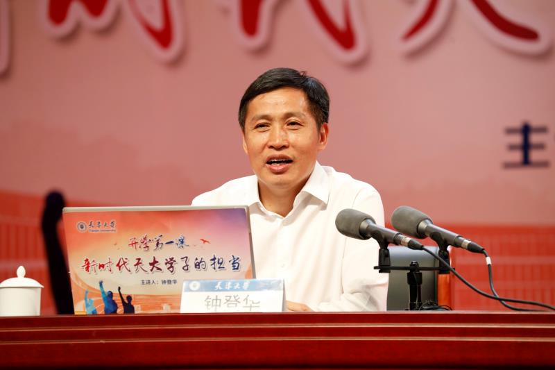 “同学们,在昨天召开的全国教育大会上,习近平总书记强调,要培养德智体美劳全面发展的社会主义建设者和接班人。你们是新时代的天大学子,要把个人发展与国家发展紧密相连。”谈到新时代青年的担当,钟登华与同学们分享了自己读《习近平的七年知青岁月》的心得感悟,勉励新生:“你们现在正值大好年华,你们所处环境已经不像过去那样艰苦,所以大家更要珍惜在大学的黄金时期,要努力成为国家需要的一流人才,在不同领域为人类发展和社会进步作出重要贡献,担当时代的使命!”如何才能真正做到有担当?钟登华给新生们传授了“四句箴言”:“要爱国、要励志、要求真、要力行。”爱国,就是要把自己的理想同祖国的前途、把自己的人生同民族的命运紧密联系在一起,涵养家国情怀。”立志,就是要勇于担当历史使命和国家大任,要勇于坚守初心、不断奋斗,要严谨笃实、脚踏实地,把远大的理想抱负和所学所思坚定落实到报效祖国的实际行动中。求真,就是求真学问,练真本领,要勤于思敏于学,更要培养创新精神、提升实践能力。力行,就是要知行合一,做实干家。钟登华勉励在座新生:作为天大学子,要有干事创业、报效国家的信念;要有与时俱进、脚踏实地改变世界的目标和能力;还要有坚持的恒心和勇气。