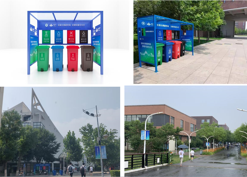 学校按照标准建成3处其他垃圾暂存点、1处有害垃圾暂存点和1处可回收物暂存点等,安装4台厨余垃圾处理设备、1台餐前垃圾处理设备;建成2套垃圾分类箱房、22套四分类桶棚,安装14台智能可回收物分类柜,3台智能垃圾分类柜,投放3300多个楼内二分类桶,600多个楼外四分类桶、100个二分类果皮箱。所有垃圾分类桶棚都张贴了垃圾分类指示牌,引导师生进行正确有效的垃圾分类投放。校内布置多处垃圾桶点位,楼内每层都放置了其他垃圾和可回收物的二分类脚踏式垃圾桶,每栋楼一层放置有害垃圾脚踏式垃圾桶。在卫津路校区33斋、52斋、北洋园校区图书馆放置二分类智能分类柜,在疫情形势下实现无接触投放。外环境的每个点位都设置了厨余垃圾、可回收物和其他垃圾的收集桶,并在各教学楼和宿舍楼设置了有害垃圾收集桶。此外,卫津路校区建设了两处垃圾分类箱房,每个箱房都有可回收物智能柜和厨余垃圾、有害垃圾、其他垃圾的收集桶,并配有上下水、空调、除臭机、消毒灯,箱房配备一名保洁员,负责垃圾二次分类、倒运和箱房卫生。学校还建立了分类垃圾台账,每月对四类垃圾清运量进行统计和记录,并对种类较多的有害垃圾、可回收物建立精细化台账。天津大学还建设完成了“天津大学有害垃圾暂存点”建设,并通过南开区主管单位验收,顺利投入使用。“天津大学积极发挥学科优势,推动生活垃圾相关科研工作创新,研发出各种新颖实用的垃圾分类设施设备,多个科研团队多点开花,学校用科技助力生活垃圾减量化、无害化、资源化处理,在垃圾分类各个环节发挥出日益显著的作用。”后勤保障部党委副书记韩婧极说。