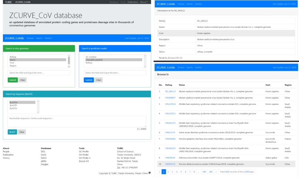 面对疫情加快蔓延的严重形势,科技界正在争分夺秒与病毒抗争,开展病毒防治相关药物的研发。鉴于目前在美国NCBI网站上公布的新型冠状病毒全基因组序列,很大一部分缺少详细的基因组注释,尤其是对多聚蛋白酶切位点的注释,天津大学生物信息中心的高峰教授、罗昊博士采用已研发的ZCURVE_CoV系列软件对包括新型冠状病毒(2019-nCoV)在内的两千余株冠状病毒的基因组进行了基因识别和酶切位点预测,并以数据库(ZCURVE_CoV Database)的形式提供网上服务(http://tubic.tju.edu.cn/CoVdb或http://tubic.org/CoVdb/)。该数据库有望为新型冠状病毒基因组结构、基因功能及病毒起源与变异以及药物研发等重大问题的研究提供科学根据。作为合作单位之一,该数据库也可在国家基因组科学数据中心(https://bigd.big.ac.cn/)网站通过跨库检索形式访问。