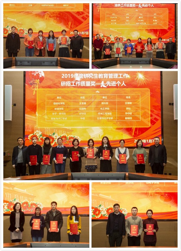 此外,本次会议还举行了“2019年度研究生教育管理工作质量奖”颁奖仪式,经个人申请、院级单位推荐、主管部门评审等程序,共24名研究生教务员被评为先进个人。王宝国等8人获“研招工作质量奖先进个人”荣誉称号,刘永静等6人获“培养工作质量奖先进个人”荣誉称号,孟莉等4人获“学位工作质量奖先进个人”荣誉称号,张舒亮等2人获“学科建设质量奖先进个人”荣誉称号,田晓庆等3人获“管理服务质量奖先进个人”荣誉称号。