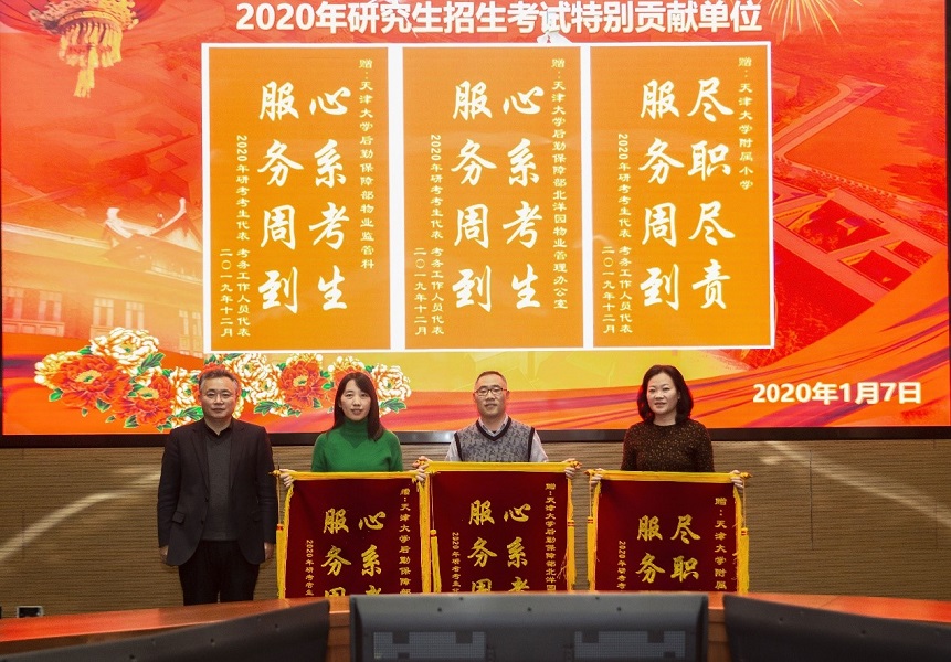 会议表彰了在2020年研究生招生生源质量提升评比中获奖的学院,机械工程学院、建筑工程学院、化工学院、电气自动化与信息工程学院、智能与计算学部获得一等奖,精密仪器与光电子工程学院、管理与经济学部、理学院、海洋科学与技术学院、表层地球系统科学研究院获得二等奖,并给予下一年度研究生招生计划绩效奖励。2020年全国硕士研究生入学考试工作中,后勤保障部物业监管科、北洋园物业管理办公室、天津大学附属小学提供了热情周到的服务,会上特颁发了考生及考务人员代表赠送的锦旗,表示感谢。