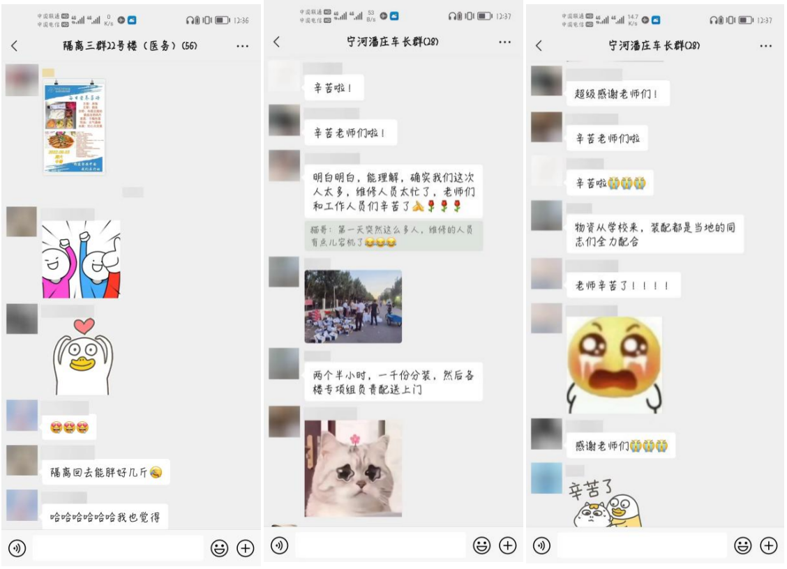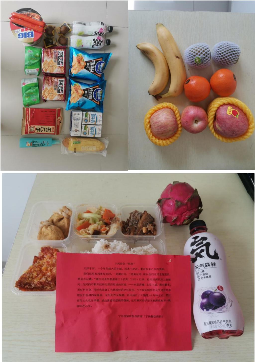 物资来了!学校的“大礼包”随着晚餐一起送到大家手中,床上用品三件套、洗漱用品、零食水果,悉心的准备让大家感受到“家的温暖”。今天加餐!“马二烧鸡”、“肉焖米饭”等宁河特色小吃让我们感受到了宁河区政府和所有工作人员对大家的“偏爱”。拒绝焦虑!校心理健康教育中心的老师和志愿者主动与大家联系,送去关心和问候。调整心情!隔离期间,北洋合唱团的老师打开直播,邀请大家来一场“沉浸式”音乐会,流动的音符给大家带来更多慰藉。