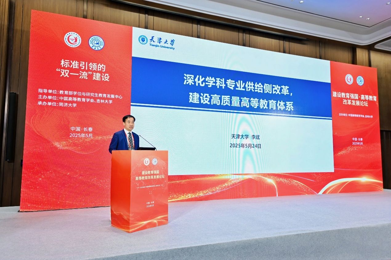 会议期间,李斌参加由同济大学承办的“建设教育强国·高等教育改革发展论坛标准引领的‘双一流’建设平行论坛”并作题为《深化学科专业供给侧改革,建设高质量教育体系》的专题报告,介绍了天津大学完善学科专业战略布局、聚力学科专业设置调整优化、推进学科专业交叉融合的总体建设与改革思路。自2025年3月启动学科建设大讨论,学校深入研讨论证提升学科建设水平学科发展战略行动计划,战略性凝练形成6大发展路径,以服务国家战略需求为核心,面向未来系统推进学科专业供给侧改革,加快培养国家急需紧缺的拔尖创新人才。