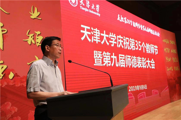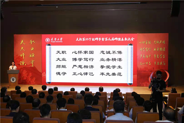 本站讯(通讯员陈少丹 摄影记者唐蒙郭程)在第35个教师节来临之际,为表彰天津大学涌现出来的一大批先进集体和优秀教师,学校于9月6日上午在北洋园校区郑东图书馆报告厅隆重举行天津大学庆祝第35个教师节暨第九届师德表彰大会。党委书记李家俊、校长金东寒、副校长元英进、副校长张凤宝、党委副书记赵美蓉、副校长巩金龙、校长助理张力新、总会计师古瑶、校长助理刘宁等校领导出席会议。各院级单位、机关部处室、直属单位主要负责人,2019年度“教书育人、管理育人、服务育人”先进工作者、师德建设先进集体、“我心目中的好导师”、“沈志康奖教金”等奖项获奖教师,以及第十一期入职培训学员代表等300余人参加了表彰大会。大会共包括两个部分,第一部分为《天津大学师德公约》发布仪式,第二部分为师德典型颁奖典礼。大会由党委副书记赵美蓉主持。
