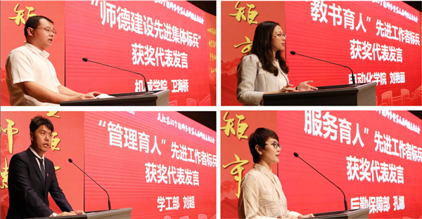 随后,四位获奖代表发言。其中,“师德建设先进集体标兵”获奖单位代表机械学院内燃机国家重点实验室卫海桥表示, 实验室自1989年成立以来,始终面向国民经济建设和科技发展的重大需求,以人才培养为己任,团结带领教师落实立德树人根本任务,不断提高人才培养质量,在党建、师德师风建设和育人工作方面开展了大量工作,今后实验室的全体教师将继续按照学校《师德公约》要求,尽心尽力做好祖国和时代赋予教师的多重角色;“教书育人”先进工作者标兵自动化学院刘艳丽在发言中表示,做老师,用纯净的心做纯粹的事,就能收获无与伦比的幸福,用严苛的标准做好该做的事,追求极致、永无止境,就能收获无可比拟的满足,用育人的初心为天大事业注入活力与动力,就能培养出优秀的学生、成为我们的代表作;“管理育人”先进工作者标兵学工部刘超表示,面对时代赋予高等教育的使命,高校管理干部要以“国之所需”为导向创新育人方式,要以学生发展为中心提升育人质量,要坚持知行合一,提升管理育人水平;“服务育人”先进工作者标兵后勤保障部孔娜表示,在学校推进“三全育人、五育并举”综合改革过程中,天大后勤人也要与时俱进,认真贯彻落实服务育人理念,以优质服务为前提、以科学管理为方法、以言传身教为手段,要将有形的服务工作化成无形的育人课堂。