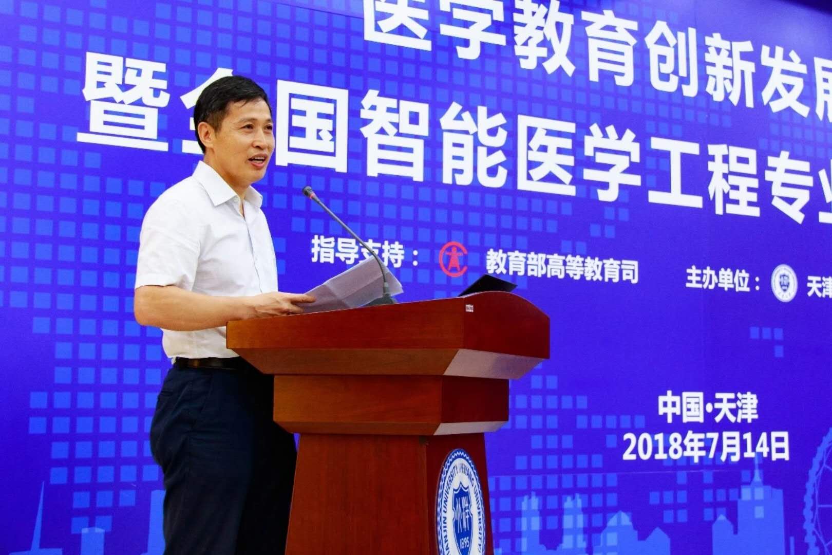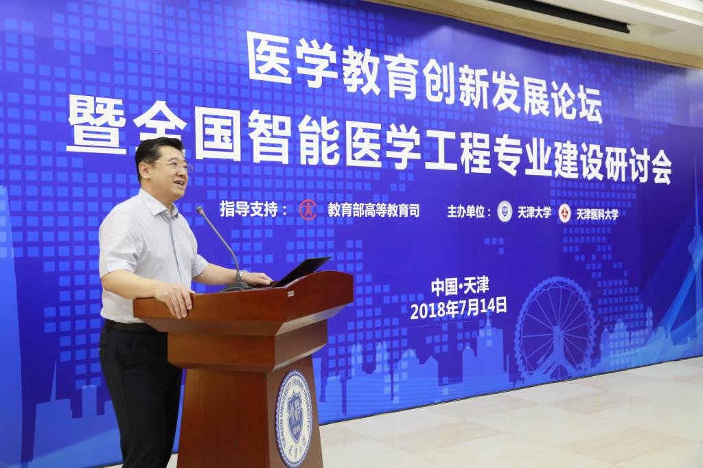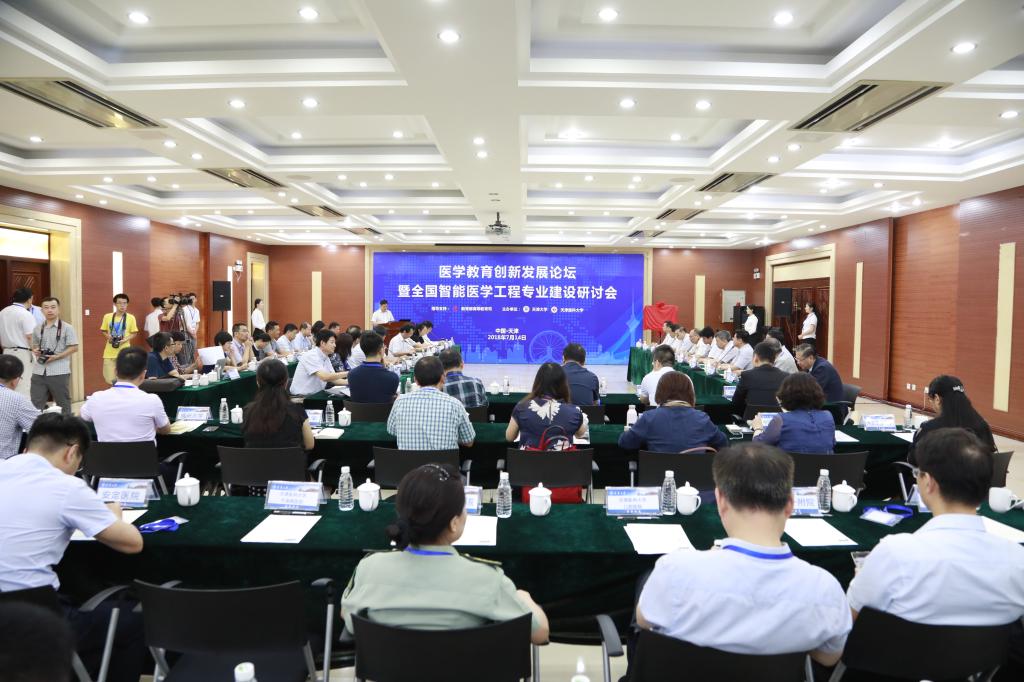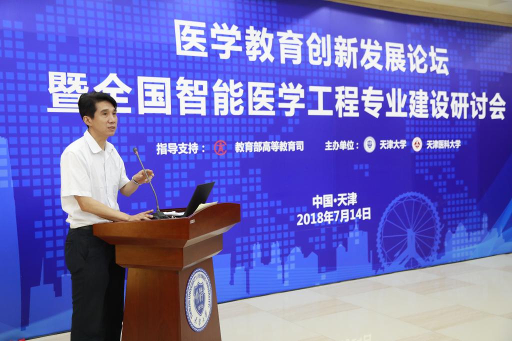 本站讯(通讯员董玥欣 摄影于福旺)7月14日,全国首届医学教育创新发展论坛暨全国智能医学工程专业建设研讨会在天津大学卫津路校区召开。本次论坛由教育部高等教育司指导,天津大学与天津医科大学联合举办。教育部高等教育司副司长王启明,天津市教育委员会副主任白海力,天津市卫生和计划生育委员会科技教育处处长高辉,天津大学医学部主任、中国工程院院士顾晓松,中国工程院院士、中国人工智能学会理事长李德毅,以及北京大学、清华大学、中国科学技术大学等26所兄弟高校,北京、天津、西安等17家三甲医院,IBM、中国电子信息产业集团等多家企业单位出席论坛。天津大学校长钟登华、副校长王树新,中国科学技术大学党委书记舒歌群,天津医科大学副校长张彤,天津中医药大学副校长孟昭鹏,南京医科大学副校长李建清及相关单位同志参会,论坛由王树新主持。