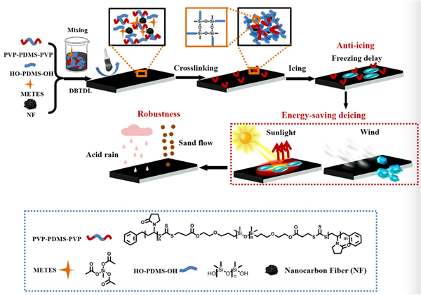 在高空高寒环境下,飞机、输电线路等设备表面结冰常常带来重大经济损失,甚至造成灾难性事故。目前主流除冰方法有电热除冰、热风除冰、机械除冰及化学制剂除冰等。这些方法效率低能耗大,甚至会腐蚀设备本身,对环境造成损害。如何制备出一种高效、节能、环保且适用于高空高寒环境的防除冰涂层成为了科学家面临的重要挑战。