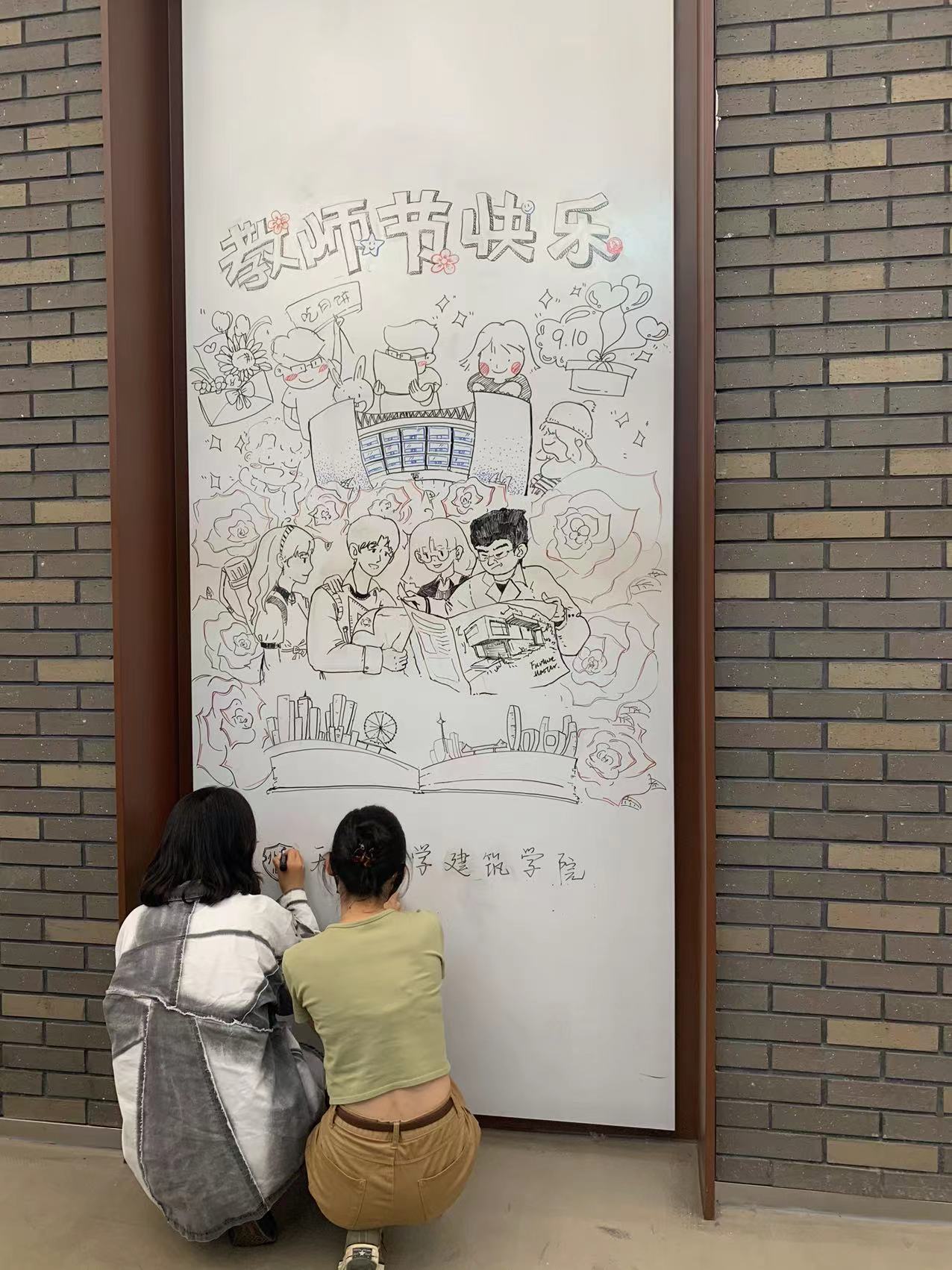 本报讯(记者赵晖)9月9日下午三点,一下课,几位建筑学院的同学就来到北馆给明天过节的老师准备礼物。建筑生的对老师的祝福是一笔一划描绘出来的。