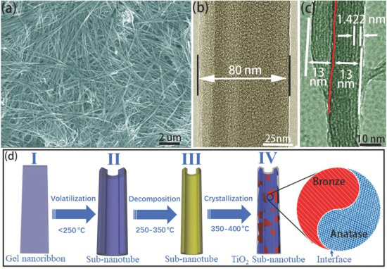 图1. a)SEM图像,b)TEM图像,和c)CH3COO- [Ti-O-Ti] -OBu凝胶的HRTEM图像。d)由凝胶转化的TiO2 SNT的制备的示意图。
