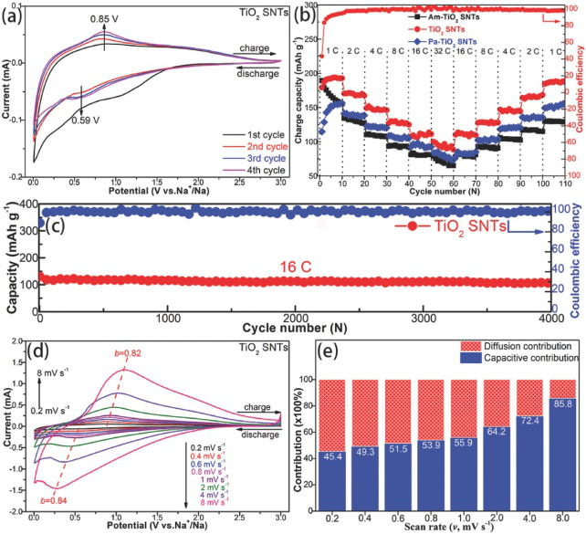 图3. Na半电池的TiO2 SNT的电化学性质:a)CV曲线。b)Am-TiO2 SNT,TiO2 SNT和Pa-TiO2 SNT的速率性能。c)16 C下的长寿命循环性能。 d)不同速率下的CV曲线和相应的e)电容贡献。1 C = 335 mAh g-1。