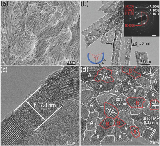 图2. a)SEM图像,b)TEM图像和相应的SAED图案,c,d)TiO2 SNT的HRTEM图像。 (b)中的插图是子纳米管横截面的示意图;(b)中的字母h,R和α分别表示SNT壁厚,外SNT半径和滚动弧度; A,B和(d)中的线分别代表锐钛矿,青铜矿和微晶界面。