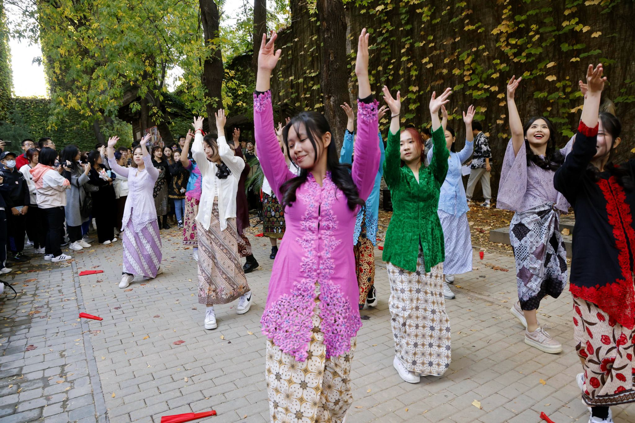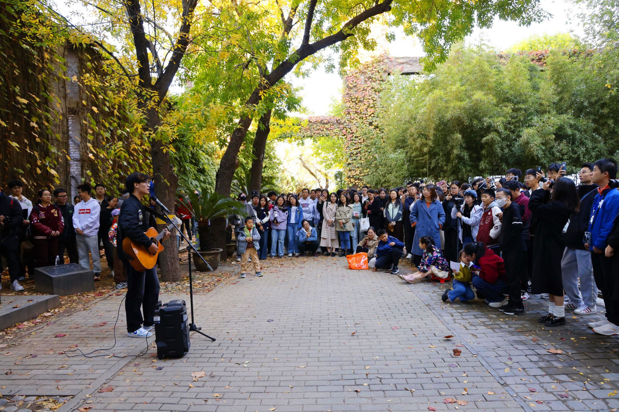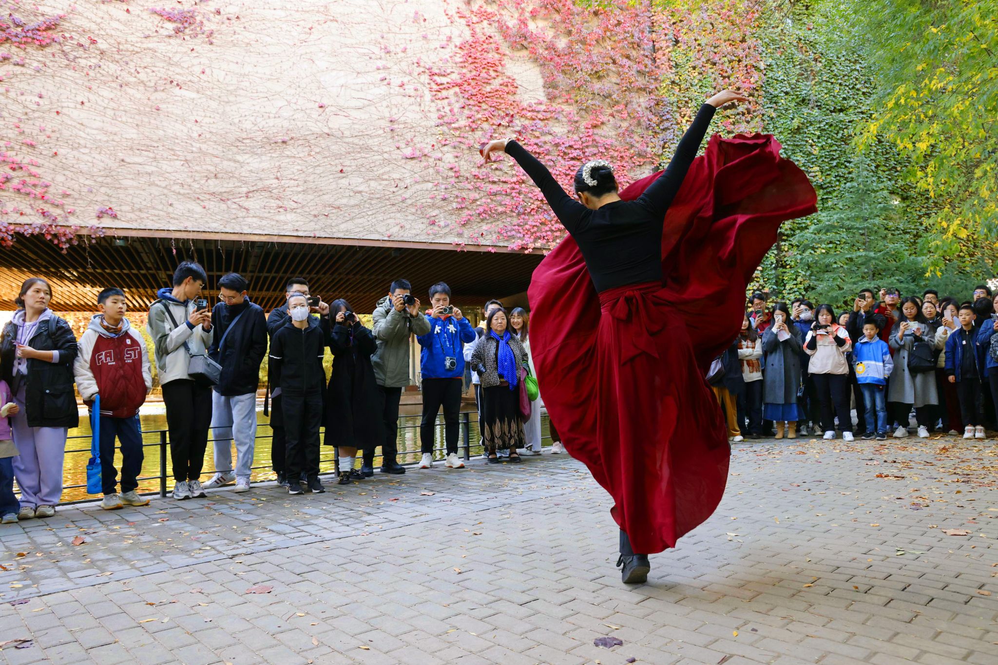 忽然,诗人徐志摩的铜像前传来歌声,原来是同学们自发组织了一场诗歌音乐沙龙。冯研院的学生们,与北洋吉他协会、天津大学主持人联盟、北洋诗词社等社团朋友们,用诗歌、音乐、舞蹈,尽情“唱秋”,抒发对美好校园生活的赞颂。来自印度尼西亚的留学生们带来家乡的歌舞,还有格鲁吉亚留学生打起中国长拳。而北洋合唱团悠扬唯美的歌声,与满墙红叶在秋风中的鸣响相应和,使人们陶醉在这美妙的时光里。