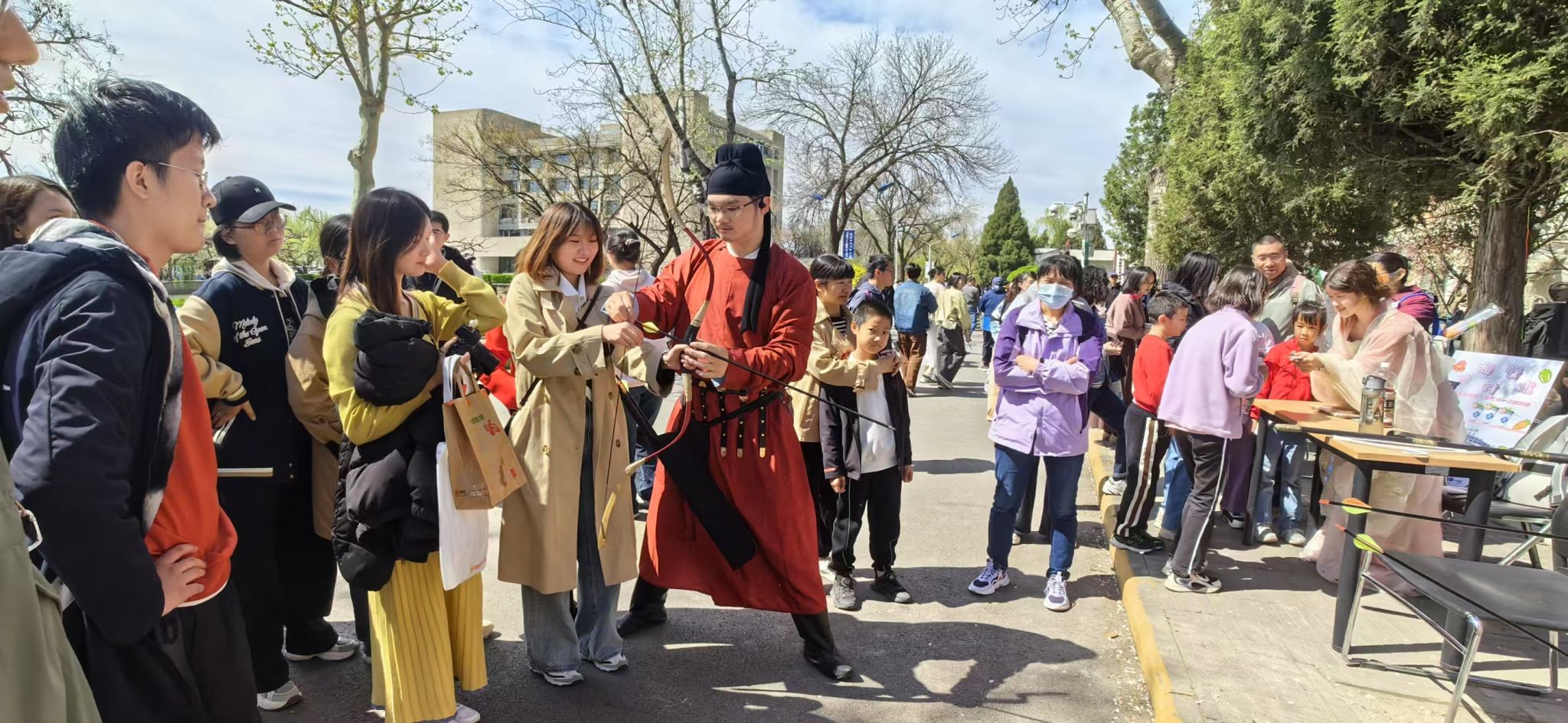 本次活动以集章解锁春日文化盛宴形式展开,互动者手持特制“文脉集章卡”,与身着汉服的志愿者展开趣味互动。这里有手持兵器模型的“古代将士”讲解都城建制与甲胄演变,带领大家现场体验箭术;有执伞少女吟赏芳菲,从花卉诗词用典出发,探讨花卉文化;有书生案前挥毫,与参与者共绘海棠长卷;有飞花令里觅诗情,现场设下“诗词擂台”……以沉浸式互动方式体验传统文化,极大激发青年学子参与热情。对此,人文艺术学院2022级李雅晴同学表示,“我们希望中华优秀传统文化能够不断传承转化,在一次次互动美育课程中变成可触碰、可体验、可发朋友圈的青春记忆。”