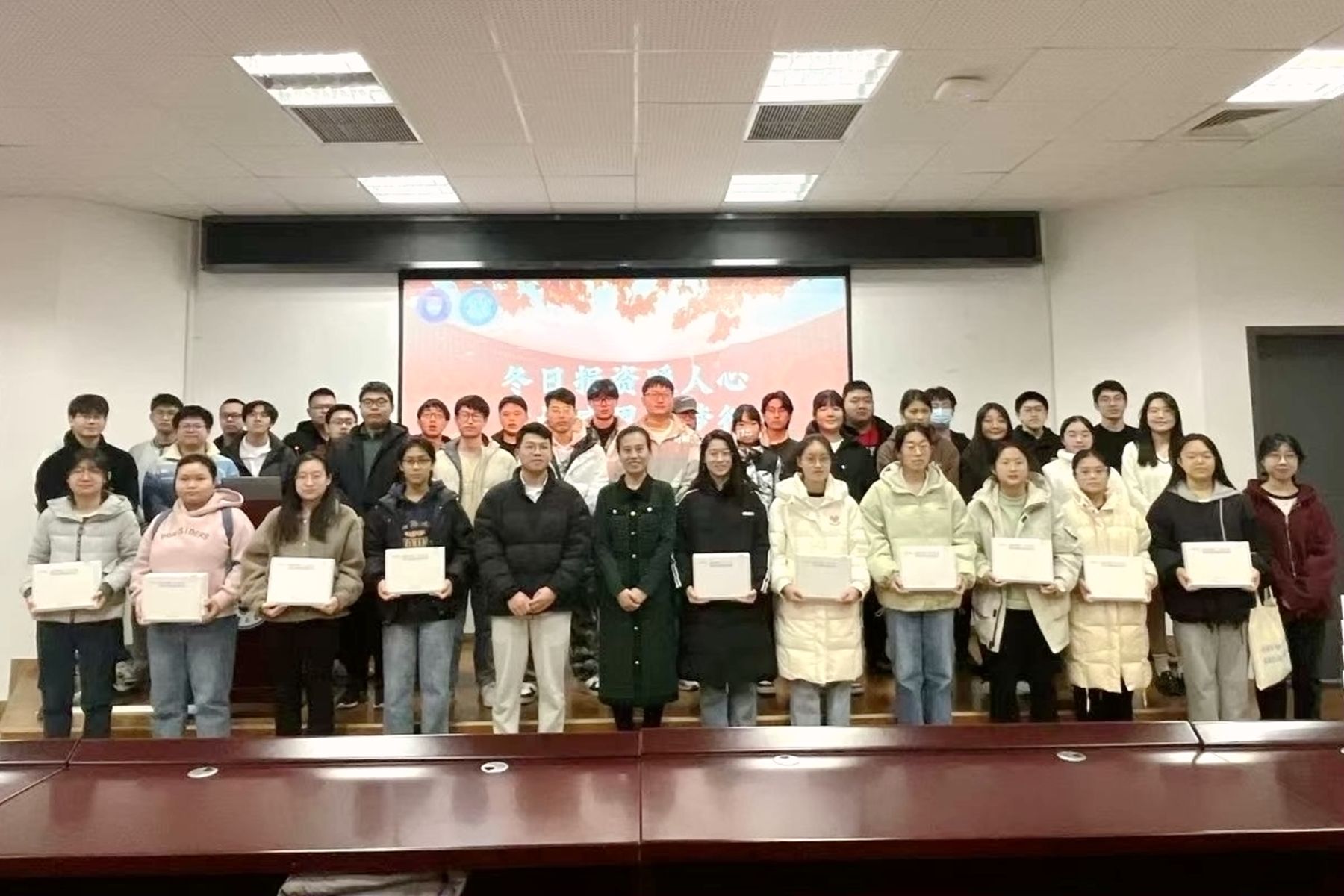 邓成满(前排左5)为学弟学妹捐赠暖冬物资