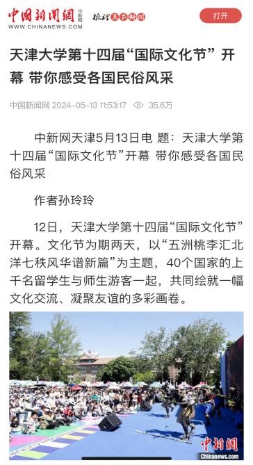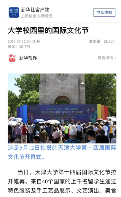 天津大学国际文化节盛大开幕后,新华社、中新社、央广网、人民网、光明网、中国青年报(头版)、中宏网、天津日报、天津电视台、今晚报(头版)、津云、天津教育报等多家国内媒体都报道了关于天大文化节的现场活动盛况,热度持续上升。海外平台包括Facebook、Instagram、Twitter、YouTube等,共发布预热及活动当天文章及视频产品25条,覆盖近3万人。