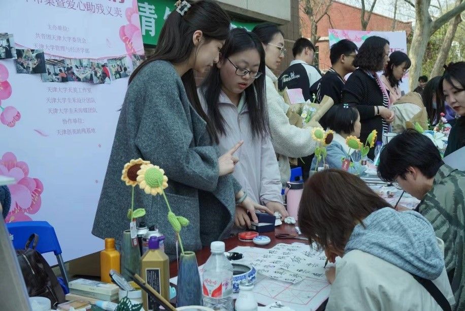 北洋工笔重彩协会的同学们联合校内多个社团以“创益共行”为主题,开展文创品展示与义卖。同学们以工笔重彩海棠古画为设计原型,共同设计,共同制作,让艺术融入天大学子的日常生活,让爱心充盈青年学子的心灵。义卖所得将全部用于支持残疾人就业与大学生创新创业。