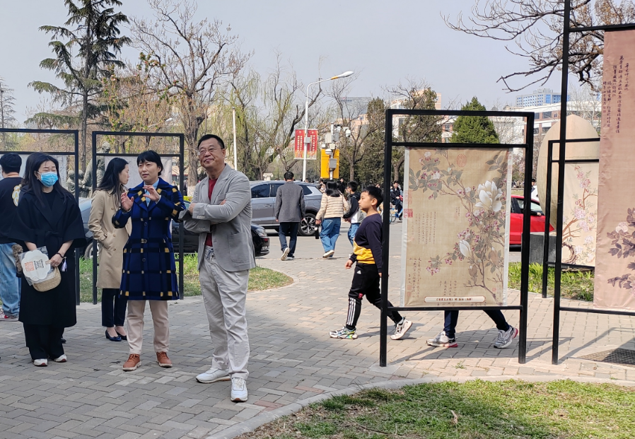在工笔重彩研究所门前的口袋画廊,伴随海棠花的盛放以及丁香花的芬芳,“花与画:历代海棠名画展”的专题展览呈现出跨越时空的美感。工笔所的师生们带领师生观众共同欣赏历代以海棠为主题的名画佳作。画上的海棠花或含苞待放,或明艳盛开,或浓丽湿润,或明快清雅,无不洋溢着春的氛围。