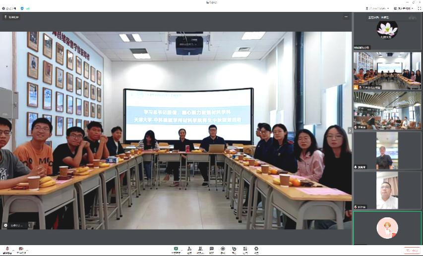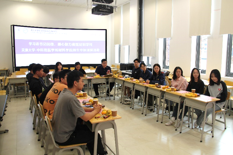 本站讯(通讯员王明阳、李寅冬)在中秋节、国庆节、校庆日即将到来之际,材料学院与中国科学院肿瘤与基础医学研究所联培师生于9月26日下午,在材料学院“师昌绪班”教室和医学所咖啡吧,通过线上线下相结合的形式,开展“学习习近平总书记回信,凝心聚力做强材料学科”主题活动,师生齐聚一堂喜迎国庆,共聚中秋,同贺校庆。中科院医学所教学部主任林叶华、研究生导师常皓、教学部老师费越、王飞云,天津大学材料学院党委副书记王颖、研究生辅导员王明阳、李寅冬,以及天津大学材料学院与中科院医学所联合培养的全体研究生参加交流座谈,共迎佳节。