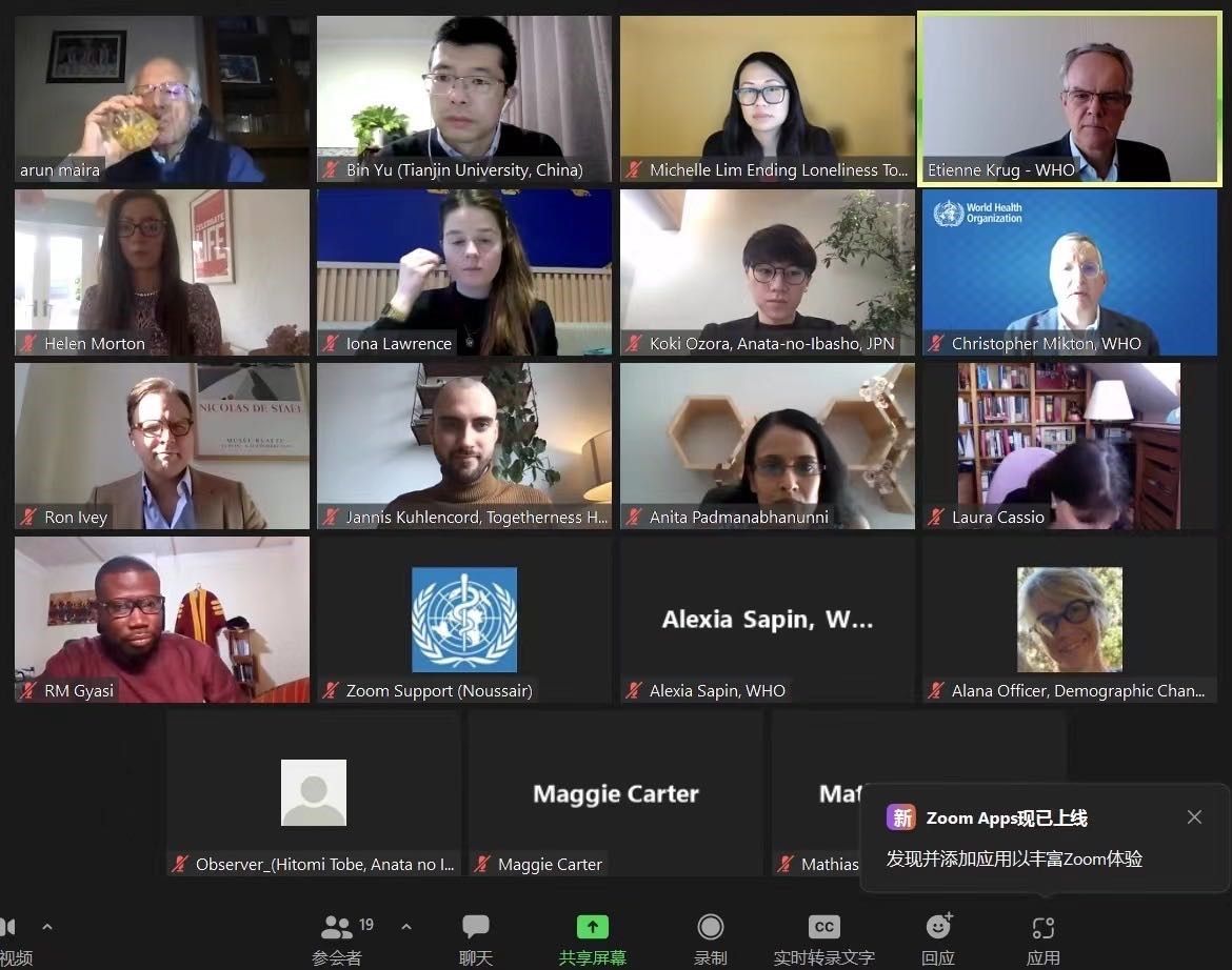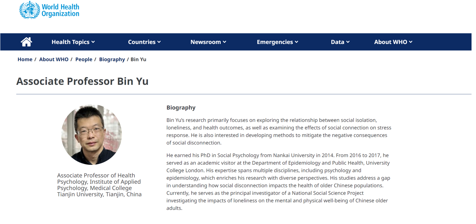 社会联结咨询专家组(TAG-SC)是世界卫生组织为应对孤独感和社会隔离产生的全球性影响并推动相关领域的研究而成立的。专家组由20名成员组成,包括心理学家、精神病学家、社会流行病学家、社会老年学家、儿科医生、公共卫生专家和数字心理健康专家。专家分别来自世界卫生组织16个成员国的研究机构与区域组织,包括哈佛大学、曼彻斯特大学、佐治亚理工学院、悉尼大学、京都大学和天津大学等。于斌副教授是中国大陆地区唯一入选该组织的成员。