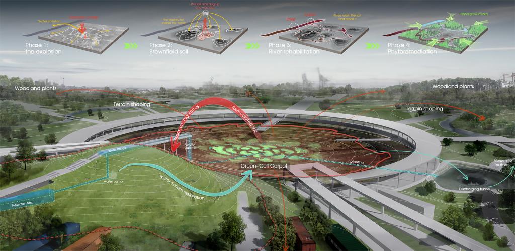 天津大学获奖作品名称为《细胞培养皿——海港公园棕地景观修复设计》。该作品方案创造性地提出了将曾遭受污染的城市海港公园作为一个“细胞生长皿”的修复策略。该策略设计提取了细胞培养皿内的两种作用力,将景观设计、生物治理和人文关怀创新性地交叉融合,赋予建筑景观以人文之美,积极探索新时代下“修复”的内涵。
