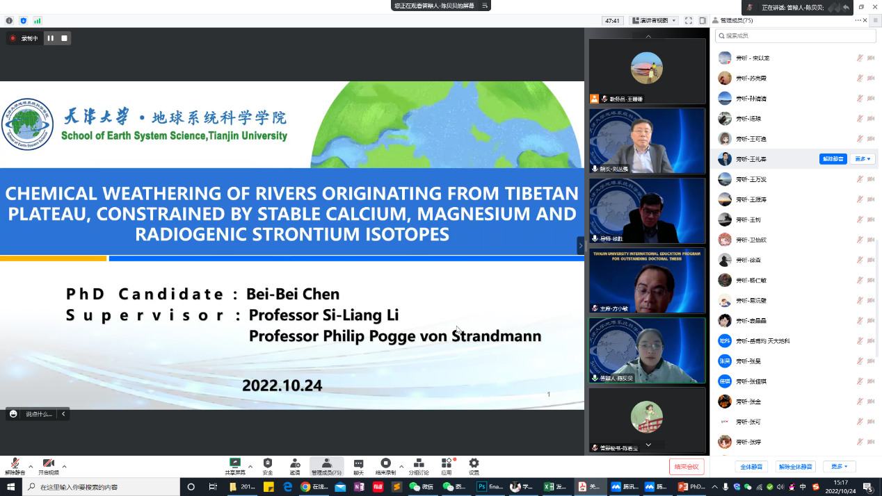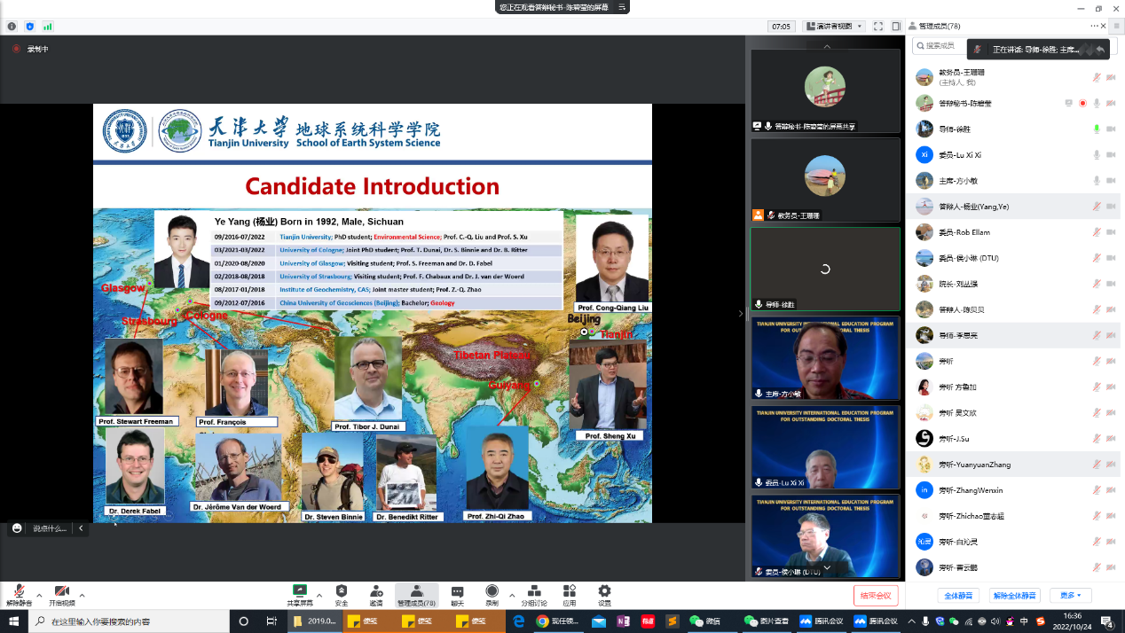本站讯(通讯员 王珊珊)2022年10月24日,天津大学地球系统科学学院(以下简称“地科院”)在线举办首届博士学位论文答辩国际评审会(以下简称“国际评审会”)。博士生陈贝贝和杨业以全票通过的成绩顺利完成博士学位论文国际答辩。本次国际评审会主席由中国科学院青藏高原研究所方小敏研究员担任,委员包括英国格拉斯哥大学Rob Ellam教授、新加坡国立大学Xixi Lǚ教授、丹麦技术大学Xiaolin Hou教授和中国科学院地理科学与资源研究所郭庆军研究员等环境及地理科学领域的国内外知名专家学者。地科院院长刘丛强院士、学生导师及70余位师生在线参会。