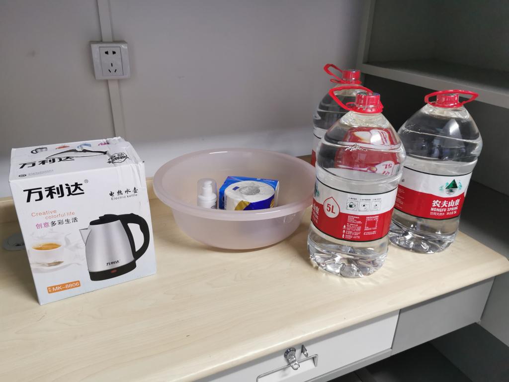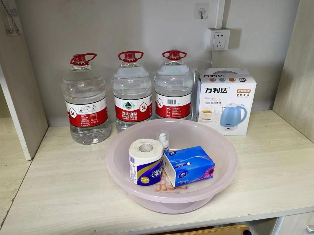 双校区的隔离宿舍,每间都经过全面的清洁和消杀,保证同学们拥有安全、整洁的入住环境。除此之外,学校在隔离宿舍中,提前为同学们准备好了纯净水、卫生纸、热水壶、手消液等生活必须品,满足日常生活需要。