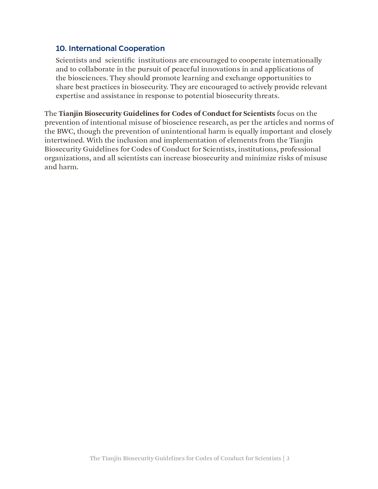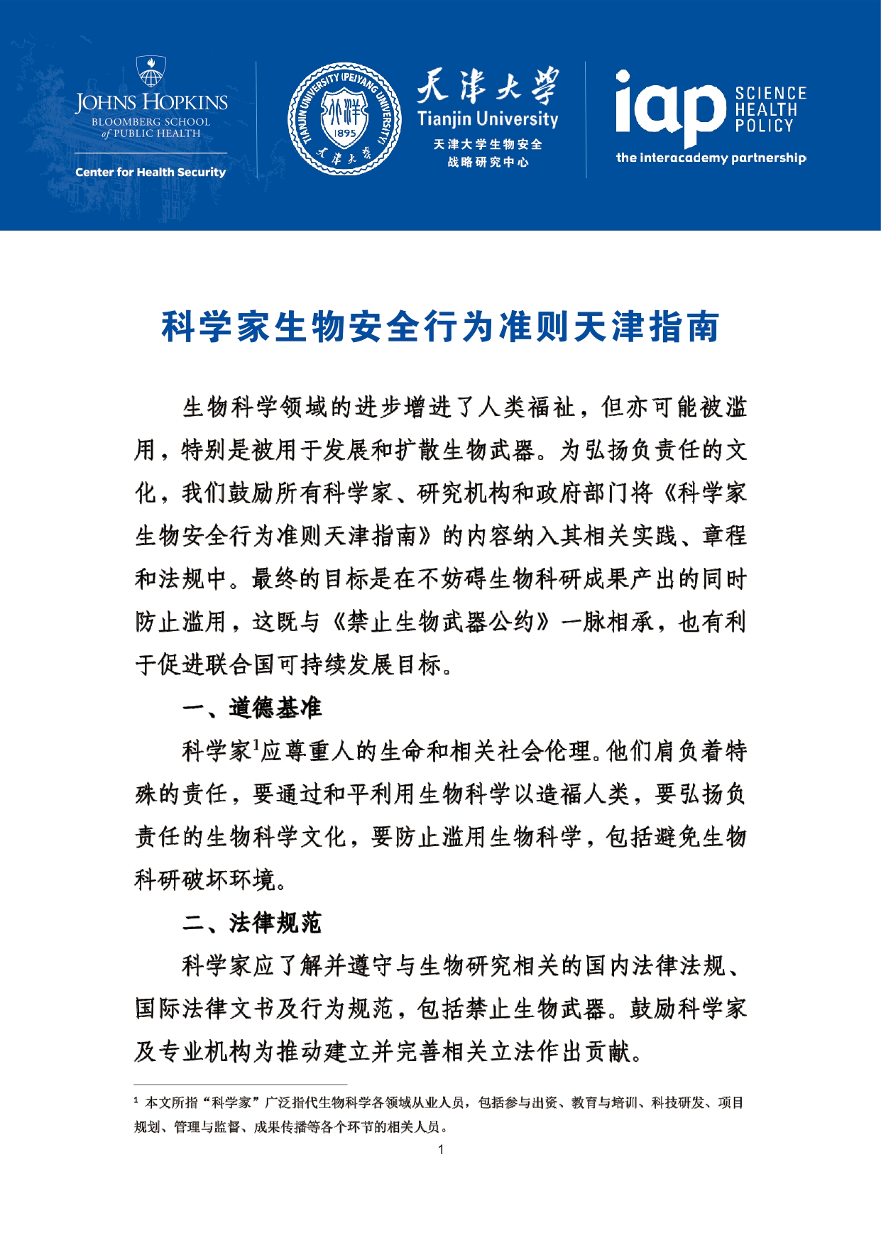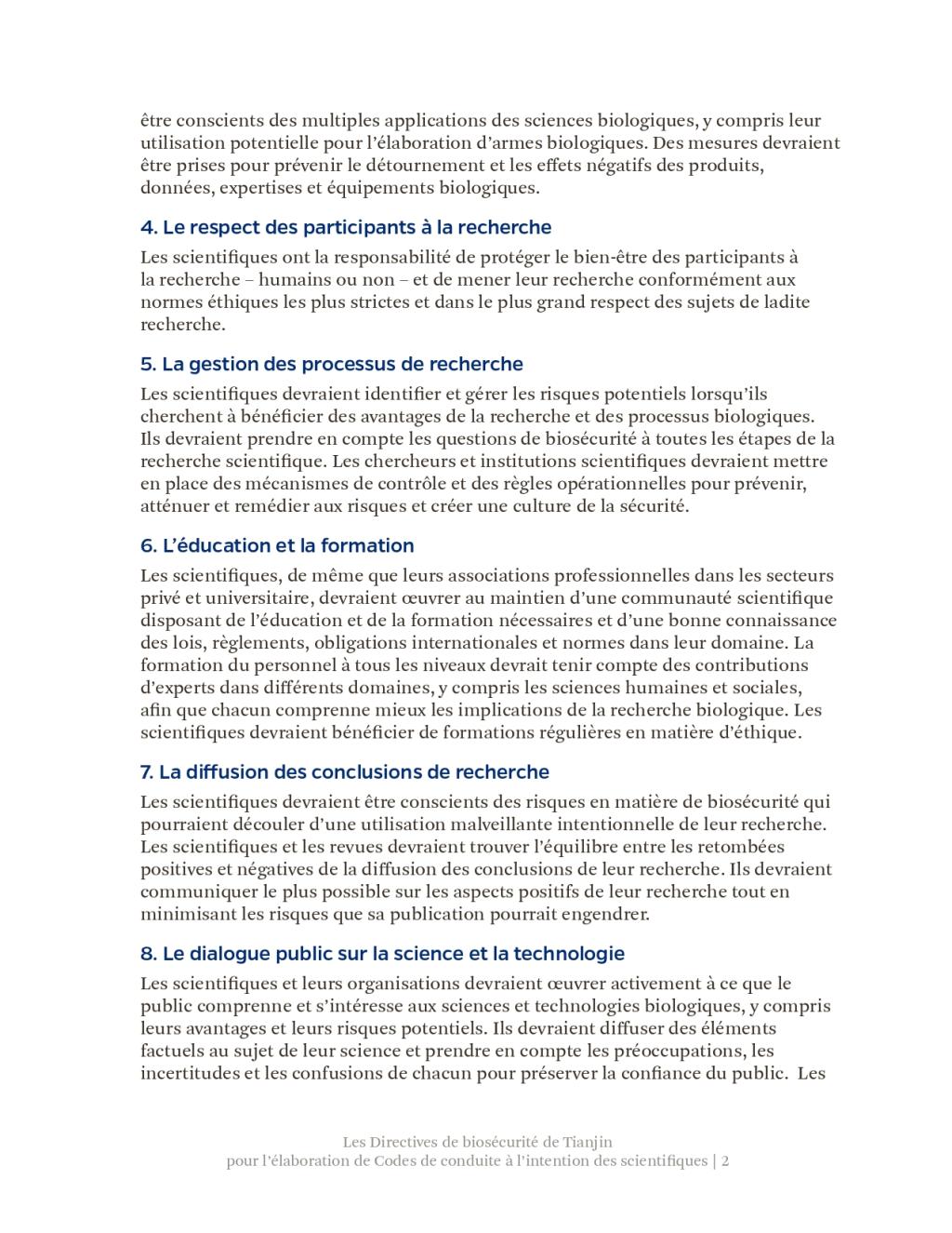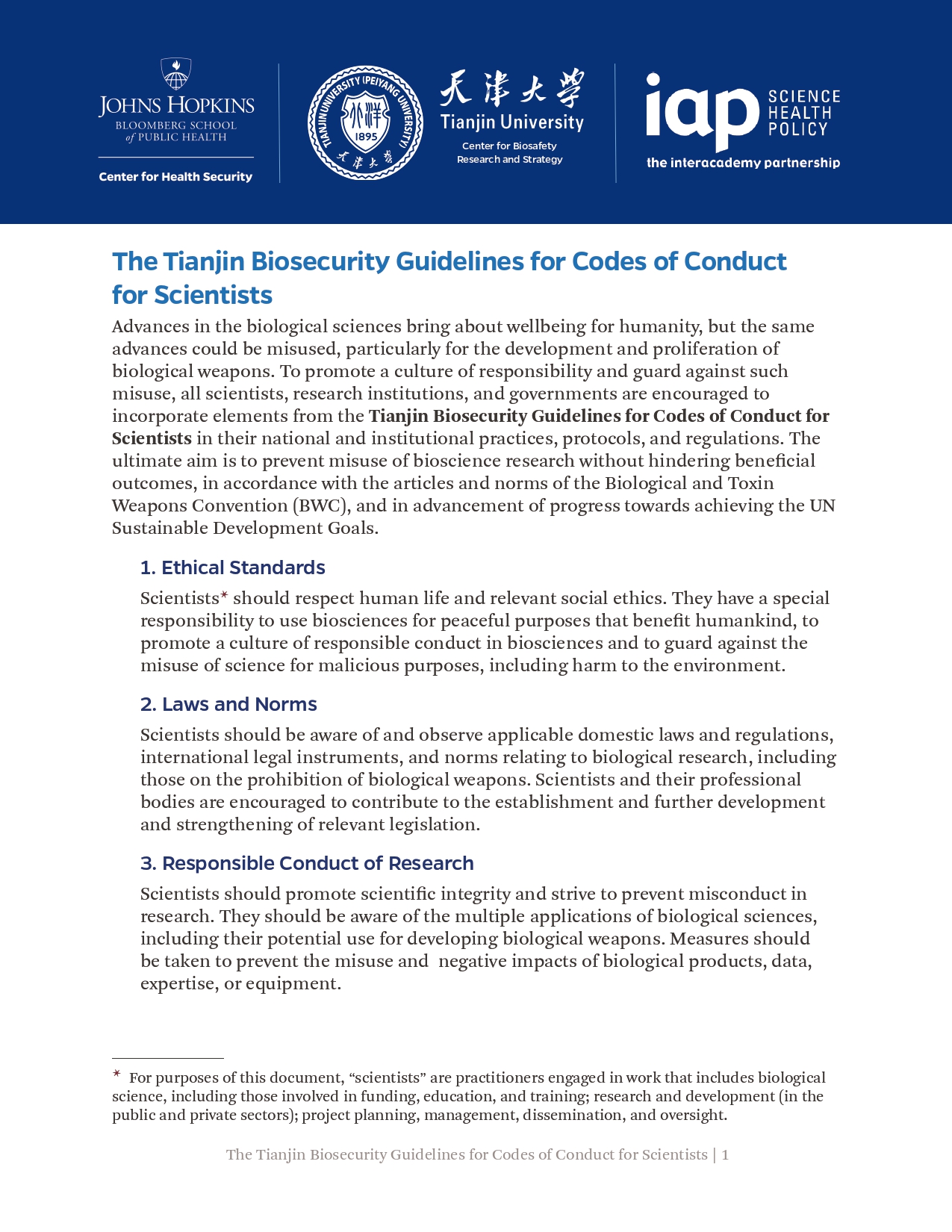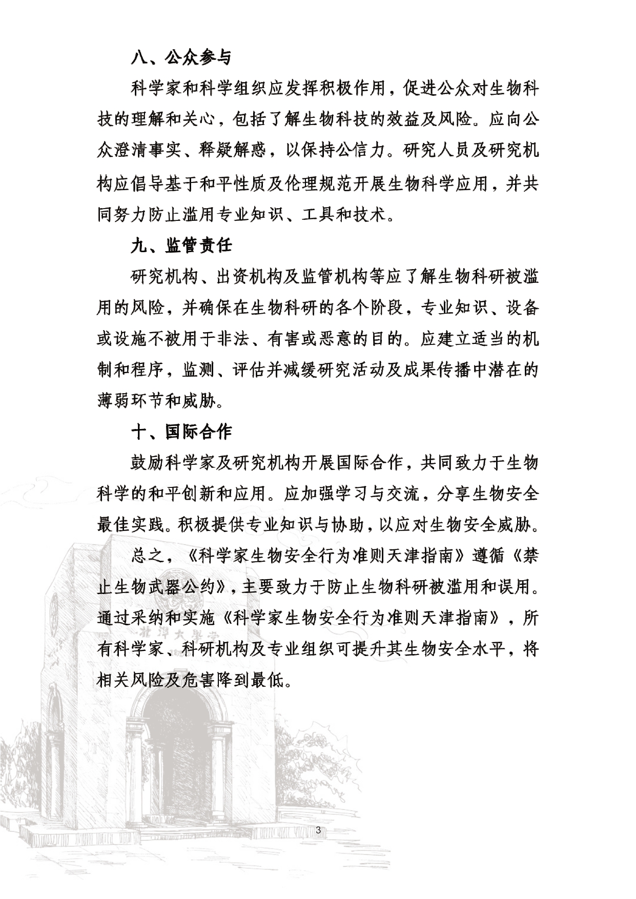 此前,《天津指南》已被国际科学院组织正式核可,并由中国和巴基斯坦共同提交《禁止生物武器公约》生物科技审议专题会议,被多国认可。生物科学领域的进步增进了人类福祉,但亦可能被滥用,特别是被用于发展和扩散生物武器。为弘扬负责任的文化,预防上述滥用,国际科学院组织鼓励所有科学家、研究机构和政府部门将《天津指南》的要素纳入其国家和机构的实践、程序和规章中。最终的目标是在不妨碍有益的生物科研成果产出的同时防止滥用,这既与《禁止生物武器公约》一脉相承,也有利于促进联合国可持续发展目标。