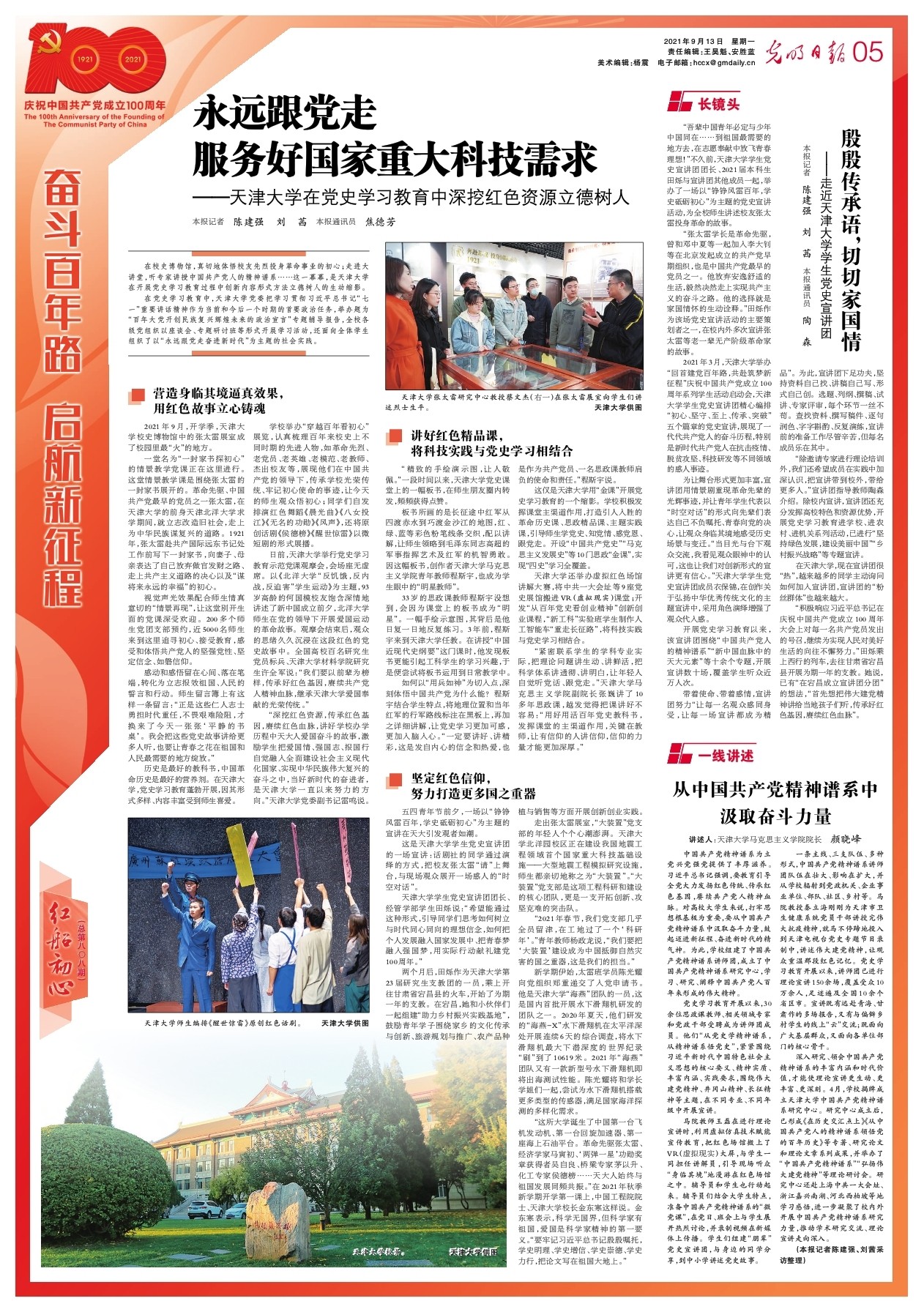 天津大学学生党史宣讲团团长、经管学部学生田烁说:“希望能通过这种形式,引导同学们思考如何树立与时代同心同向的理想信念,如何把个人发展融入国家发展中、把青春梦融入强国梦,用实际行动献礼建党100周年。”