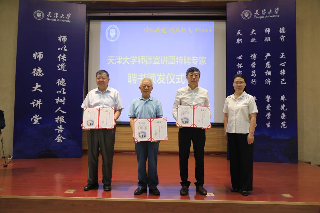 赵美蓉为“天津大学师德宣讲团”特聘专家颁发聘书并讲话。马克思主义学院颜晓峰、马克思主义学院孙兰英、马克思主义学院王新农、建工学院张社荣等四位教师被聘为“天津大学师德宣讲团”特聘专家。