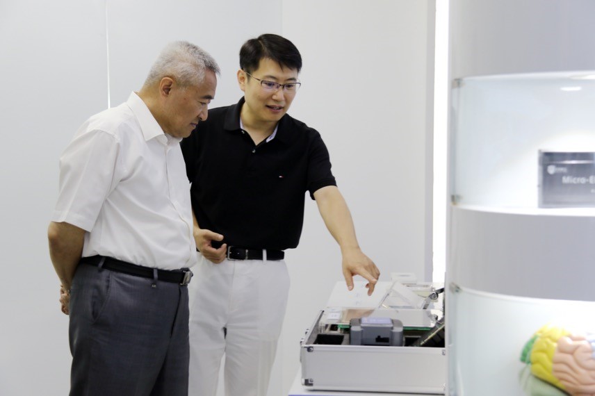 医学部执行主任、医工院院长、市政协常委、九三学社市委会常委明东详细讲解了相关科研项目关键技术、创新前景和产业化情况。明东介绍,学部科研工作始终坚持四个面向,以“医学牵引、工程支撑、转化创新、临床示范”为理念,促进工科、理科等传统优势学科与医学学科交叉融合,培育新兴学科生长点,规划良好学科生态,力争以科技力量守护人民生命健康。