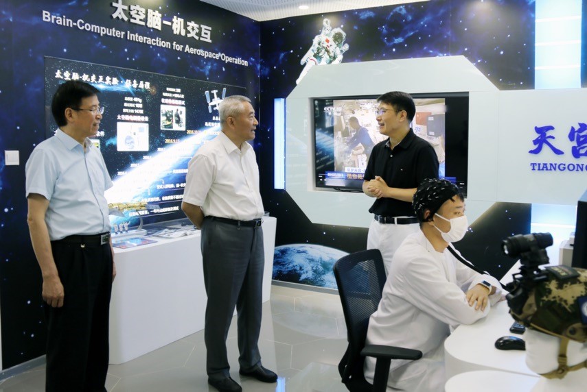 在医工院实验楼展厅,邵鸿一行饶有兴致地了解学校兴医的历史沿革,听取了学部科研团队自主研发的脑-机接口技术在康复医疗和航空航天中的重大应用,并现场观摩了人工神经康复机器人系统及面向特种应用的高I性能脑-机交互实验平台,亲切询问了相关研究的最新动态。