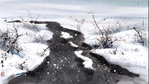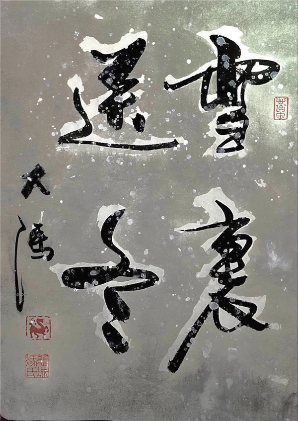 字写好之后,感觉单单几个字,没有把心里边的风雪表达出来,一时忽想,为什么不画出来呢?这便用水墨在字的背后渲染出一片寒天,同时用“留白”的方法给这四个字上边留出厚厚的积雪,再以浓浓淡淡的铅白弹上漫天的飞雪……我觉得这正是自己此时此刻的心境了!我把这幅字的电子图片发给一些好友,朋友们都受到触动;推开沉重的旧岁,迎接光亮和轻快的新春——这不也是今年大家共有的非常特殊的吉语吗?