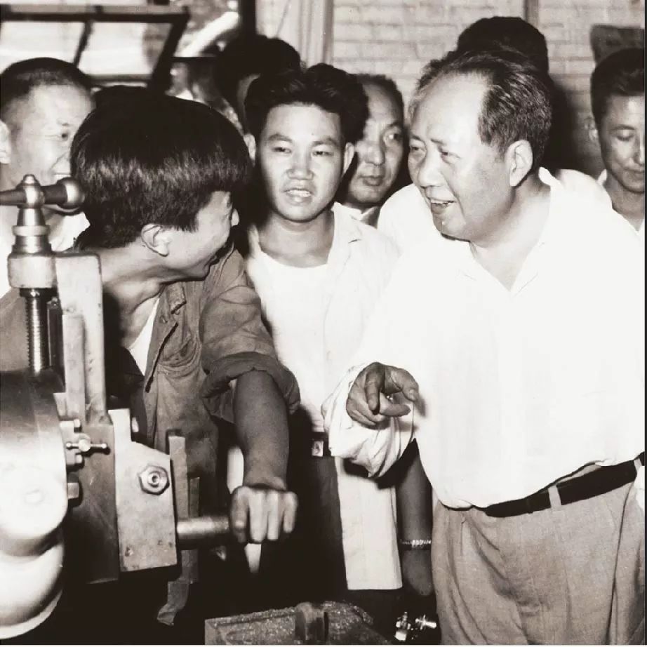 随后,毛主席先到学校的机工厂、制配厂。他几乎在每台车床前都停下来对同学询问和交谈。他走到学生王红云的面前,仔细看她的操作情况,王红云谈到自己的车床很好使。毛主席说:“你很爱你的车床呀!”,并伸出手来和她握手,王红云说:“我的手上有油,”把沾满油污的手缩了回去,但是毛主席还是和她握了手。