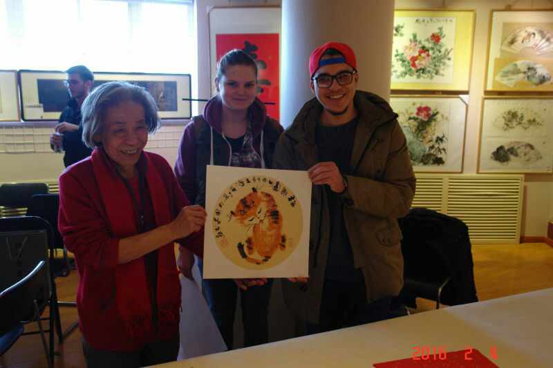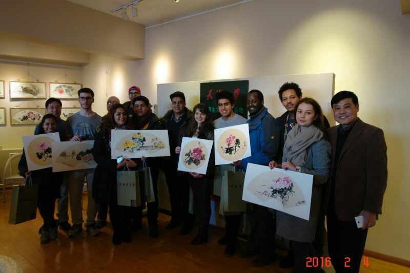 国际教育学院和国墨书画馆领导共同揭牌,画家现场作画,令留学生大饱眼福,感叹精美画作的艺术魅力,国墨书画馆还向留学生赠送了福字和书画作品,每位留学生用中文给画家拜年,祝新春愉快!(编辑 靳莹)