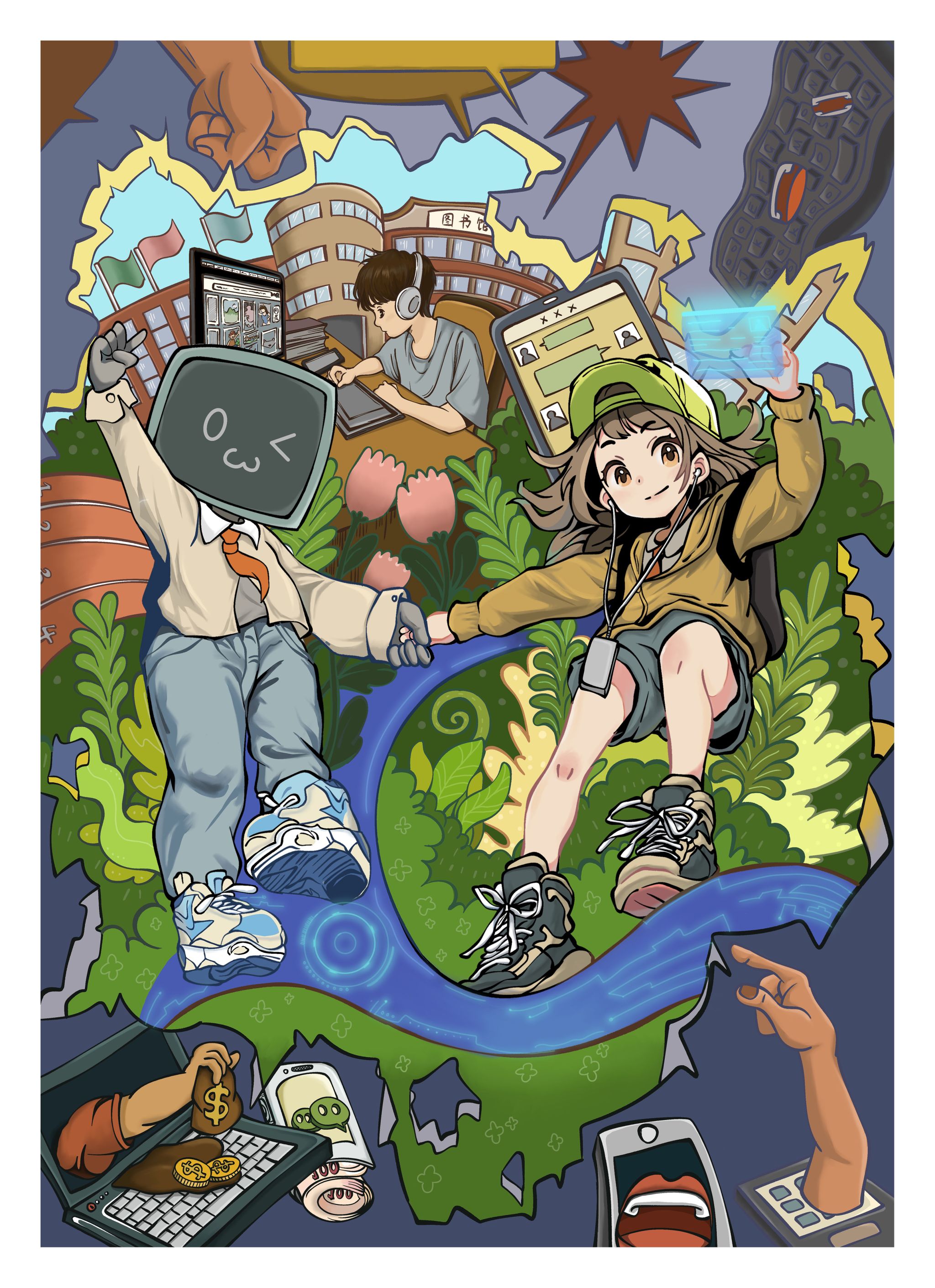 作品主体物采用一个学生形象和一个拟人化网络形象,两人携手打破网络不良、负面信息墙壁枷锁束缚,净化网络环境,让网络环境开满绿色之花。整体画面分为前中后三部分,前部分是主体物,中间是被打碎的负面信息墙壁,背景是即将迎来的绿色网络环境。该作品主题在于呼吁学生们自觉抵制网络上的各种诱惑、自觉甄别网络上各种信息真假、抵制网络暴力,抵制各种负面信息,积极主动传播正能量,共创健康清朗网络环境。