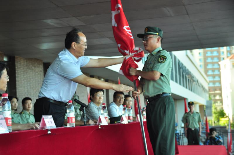 授旗仪式上,校长助理刘宁给军训团参谋长李帆授团旗,各连副连长从与会领导手中接过连旗;一面面鲜红的旗帜在风中随着军歌飘扬。