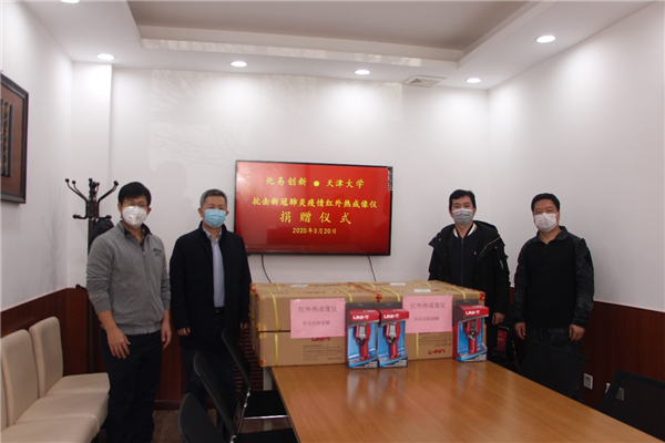 本站讯(通讯员 赵若昕)3月20日,北京兆易创新科技股份有限公司向天津大学捐赠40台红外热成像仪,用于学校师生密集区域的体温筛查,支持天津大学“新冠”病毒疫情的防控工作。天津大学校友与基金事务处处长潘峰、后勤保障部副部长李强、精仪学院副院长高波代表学校接受捐赠。