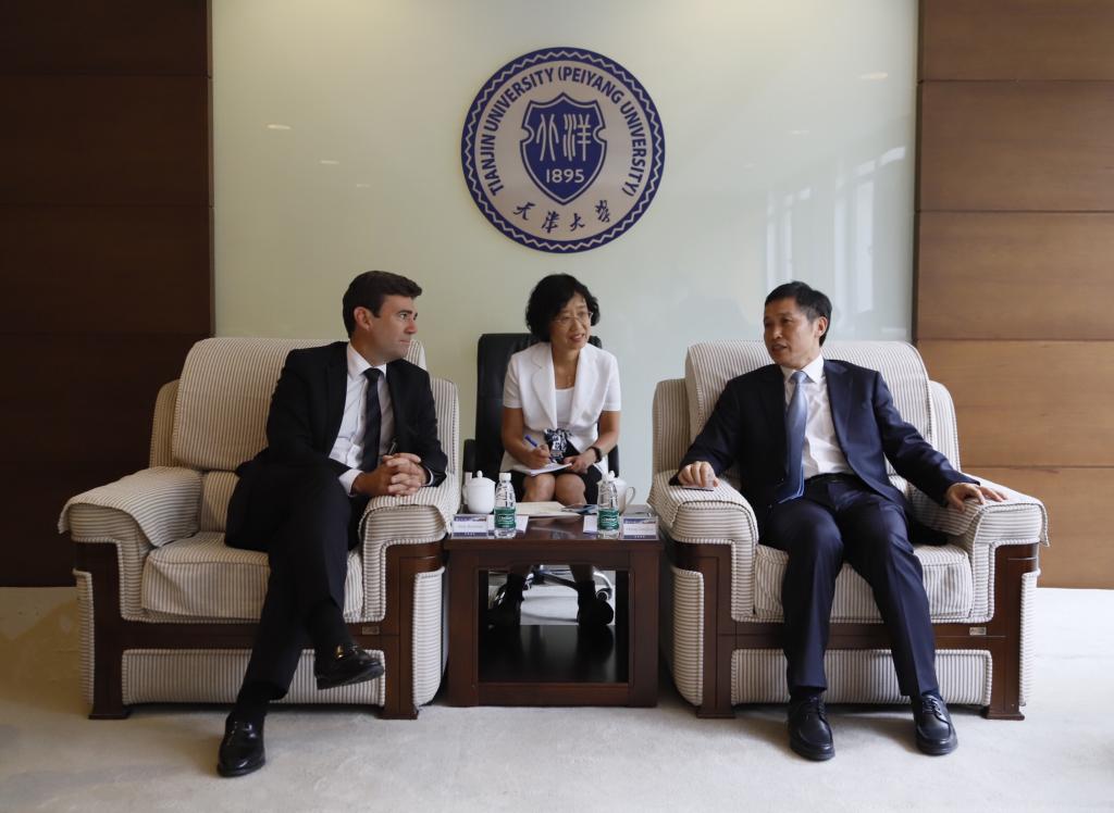钟登华代表天津大学对Andy Burnham一行来校访问表示热烈欢迎。他简要介绍了学校的历史沿革、人才培养及优势学科,特别是天津大学在新工科、医工结合及人工智能方面所做出的努力和取得的进展。他表示,很高兴得知此次有曼彻斯特大学代表随团访问天津大学,两校有着很深的历史渊源,天津大学原校长史绍熙于1949年从曼彻斯特大学获得博士学位,并在担任学校校长期间于1987年主持建成了第一个内燃机燃烧学国家重点实验室。近年来,两校合作密切,成果颇丰。希望借此次郡长访问契机,加强两校交流,特别是在智能医学领域的合作。Andy Burnham在发言中表示,十分高兴借着参加达沃斯论坛会议的机会到访天津大学,天津大学在创新、产学研合作等方面有着很强的优势。希望通过此次会晤,推动中英双方在智能医学教育和产业领域的发展,并为天津大学和曼彻斯特大学搭建学术交流和合作的平台。
