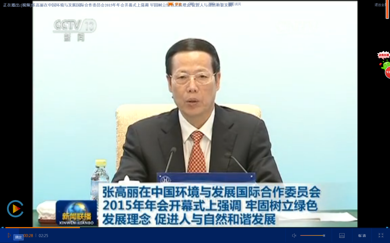 张高丽副总理在开幕式上的讲话中强调要牢固树立绿色发展理念,促进人与自然和谐发展,他指出,中国政府支持国合会长期发展的态度是一贯的,希望国合会发挥人才资源丰富、具有国际视野和战略思维的优势,面向中国生态文明建设的战略需要,努力打造环境与发展领域的高端国际智库,为促进中国与全球可持续发展作出积极贡献。