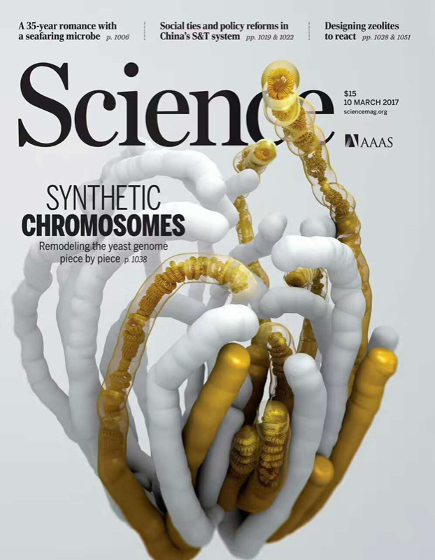 《科学》封面文章刊登的是人类科学领域最前沿最重要的科学成果,北京时间2017年3月10日凌晨三点出版的国际顶级学术刊物《科学》,呈现的是科学家们在人工合成生命方面的进展。这次科学家们共完成了5条染色体的化学合成,其中中国科学家完成了4条,把Sc2.0计划向前推进了一大步。天津大学团队完成了5号和10号两条染色体的化学合成,并开发了高效的染色体缺陷靶点定位技术和精准修复技术;清华大学团队完成了12号染色体的合成;华大基因团队联合英国爱丁堡大学团队完成了2号染色体的合成。